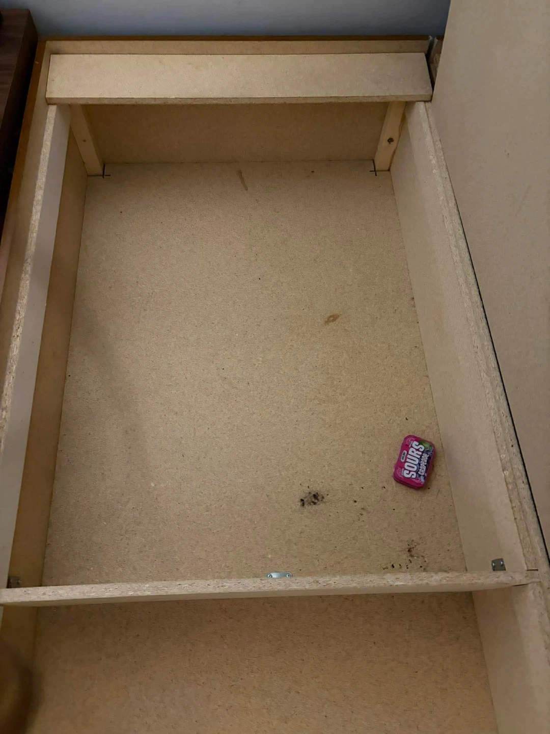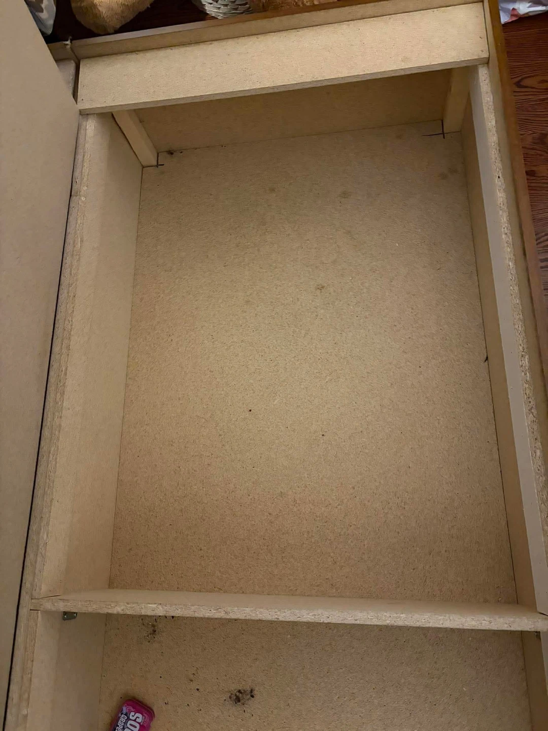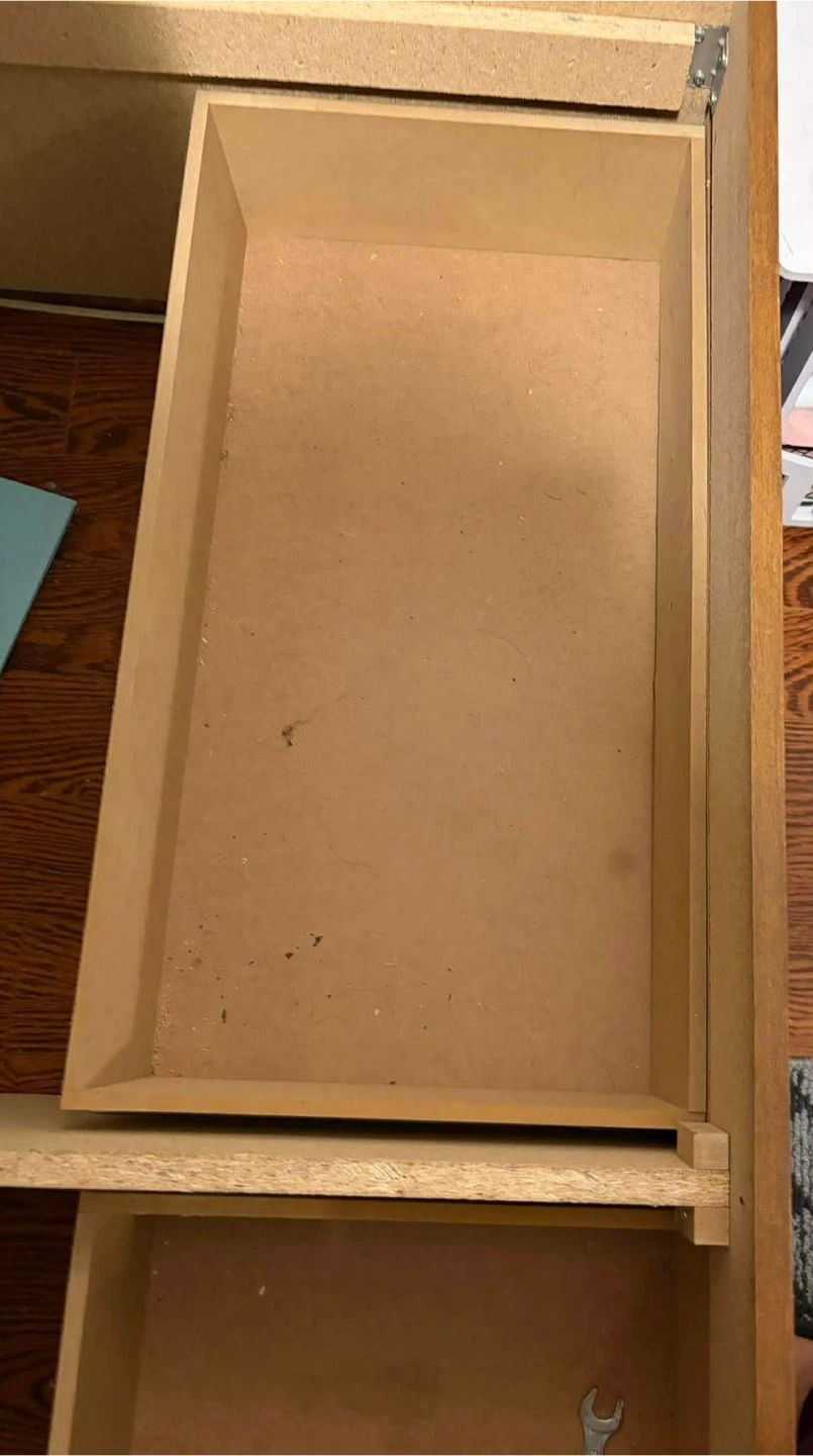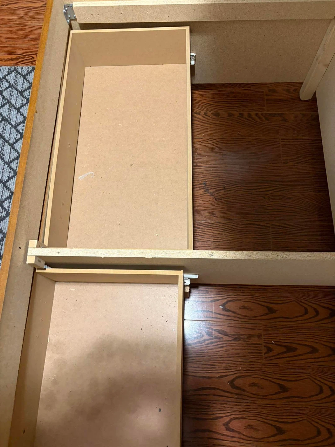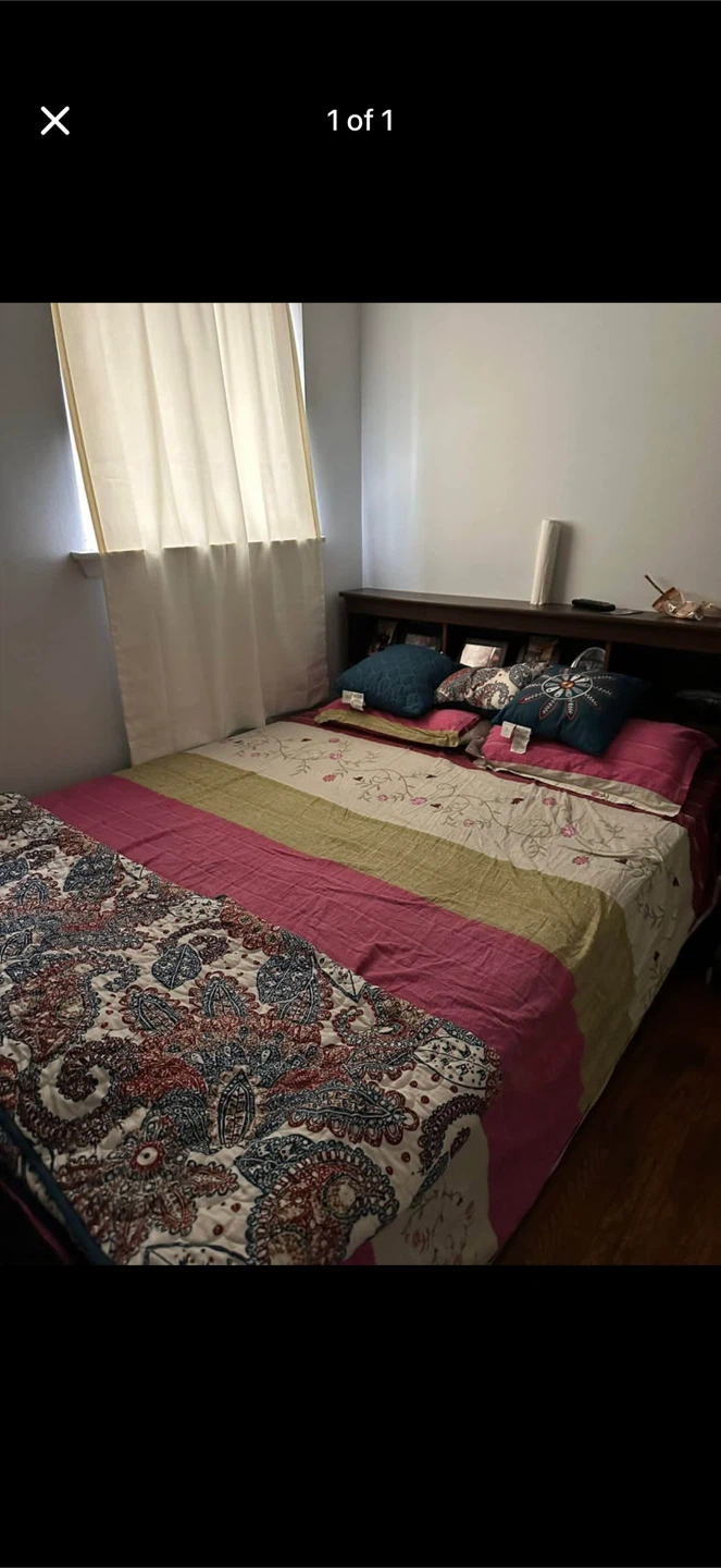 This is a sturdy wooden headboard with a built-in shelf. It also includes three large storage drawers that fit under the bed frame. The wood finish is a warm, dark brown.