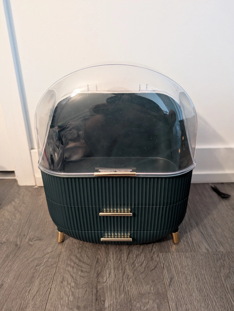 Selling a variety of items including a cosmetic organizer with drawers, a black mouse, an Apple keyboard, a hair brush, and a bidet set