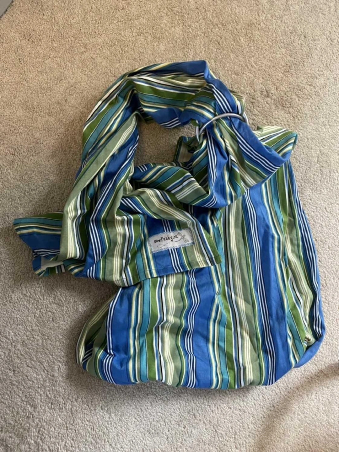 The sling is adjustable and can easily fit in a diaper bag or purse. The open tail allows you to adjust your sling perfectly and comes in handy for a blanket or sun shade.