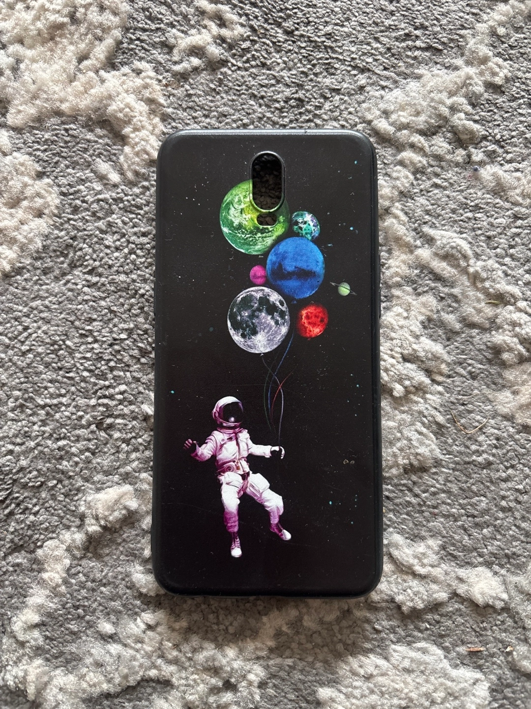 Black phone case. Features an astronaut holding planets. Great for phone protection and unique style.