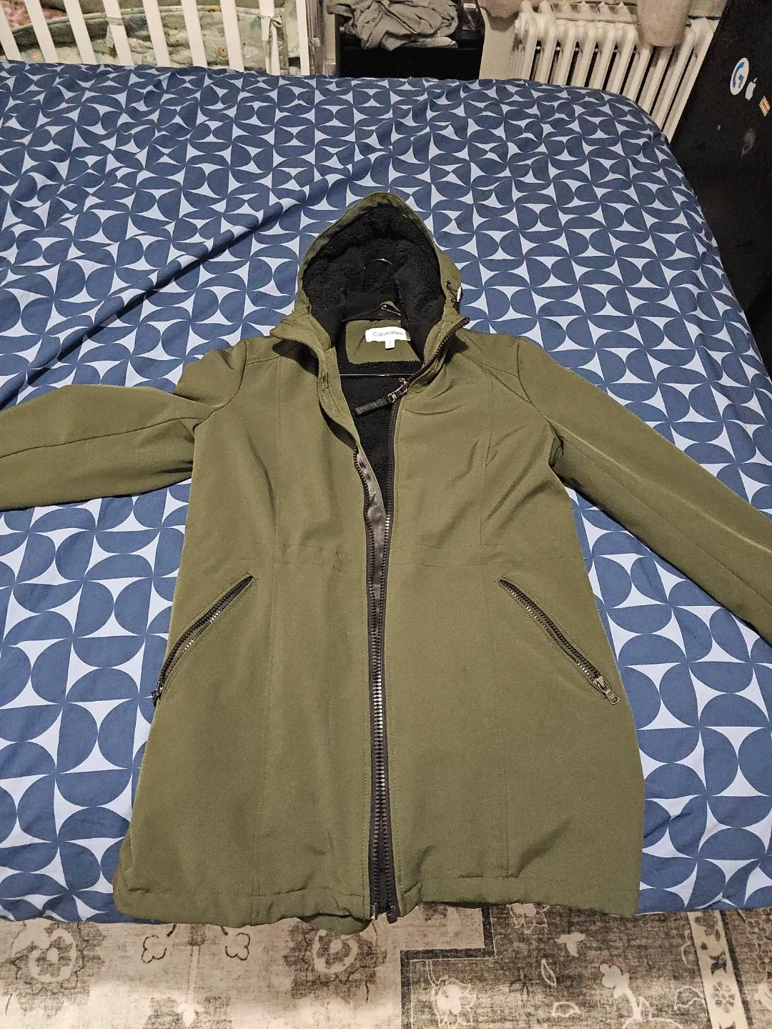 Calvin Klein hooded jacket in olive green. It's lined with black fleece for extra warmth. Features a full zip front and zippered pockets.