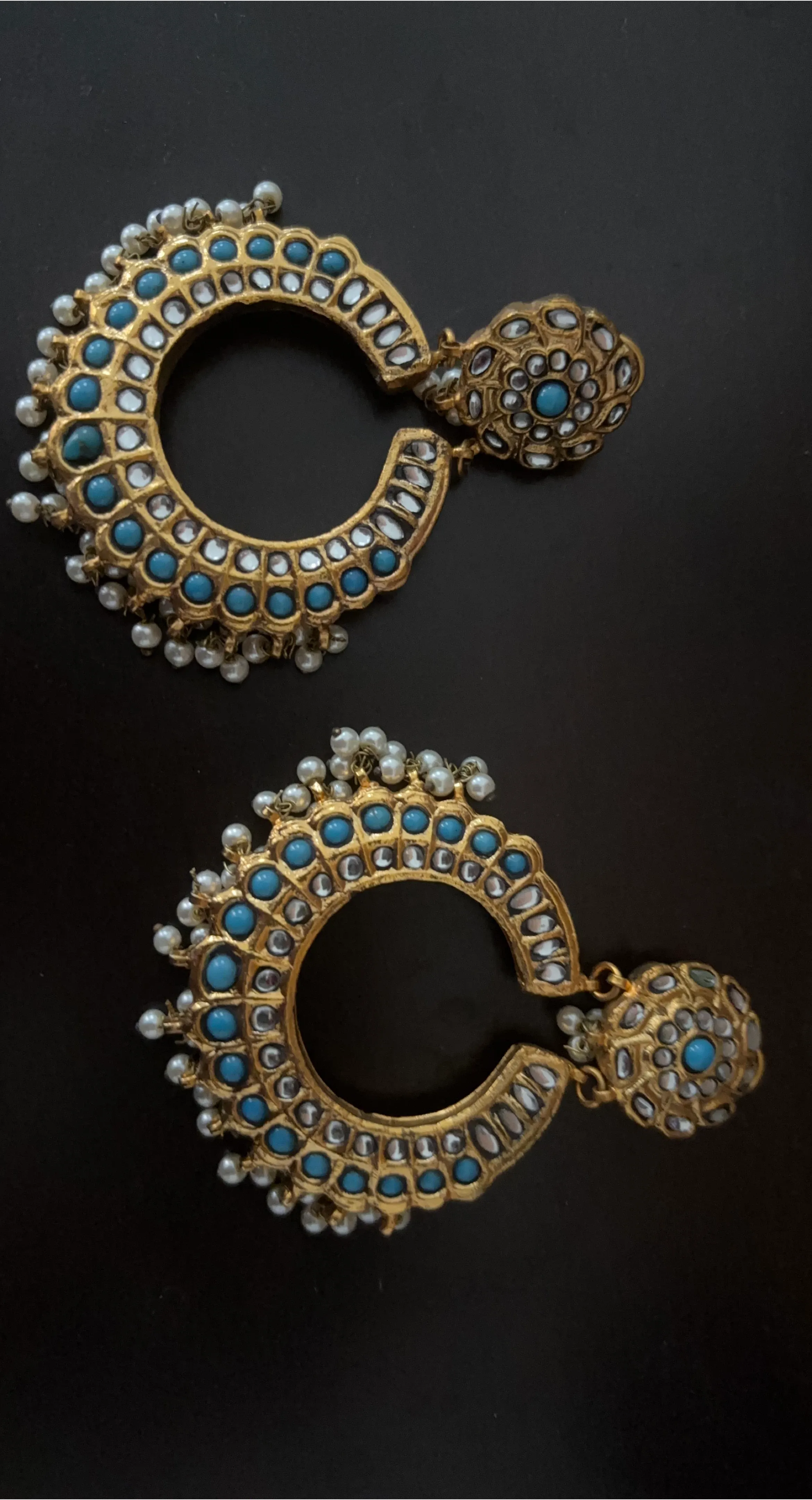 These beautiful gold-tone hoop earrings are adorned with vibrant turquoise stones and small pearl accents. They feature an intricate design, perfect for adding a touch of elegance to any outfit. The earrings are designed for pierced ears.