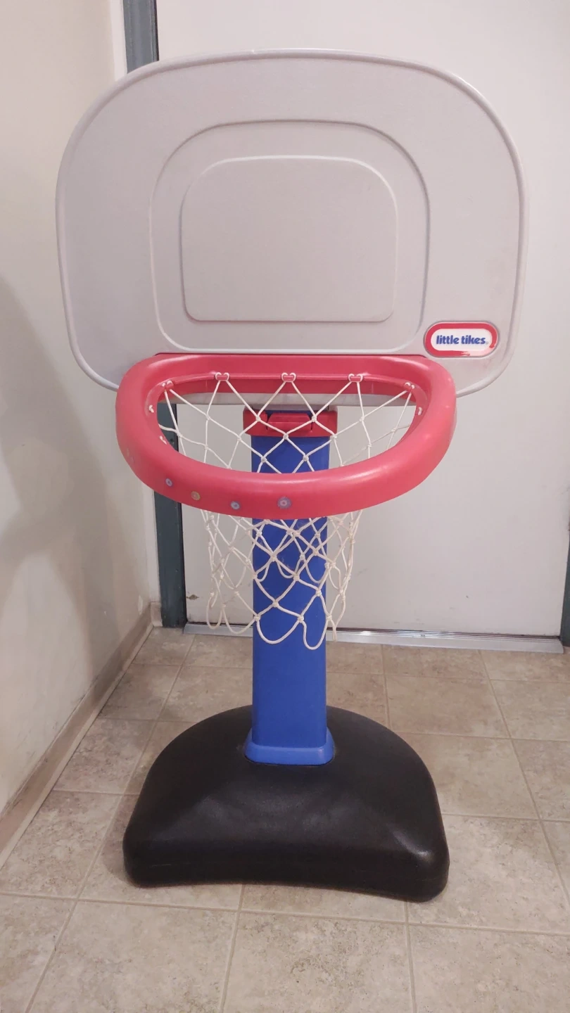 This Little Tikes basketball hoop is blue and red with a white backboard. It's adjustable for growing kids. This toy is great for indoor or outdoor play!