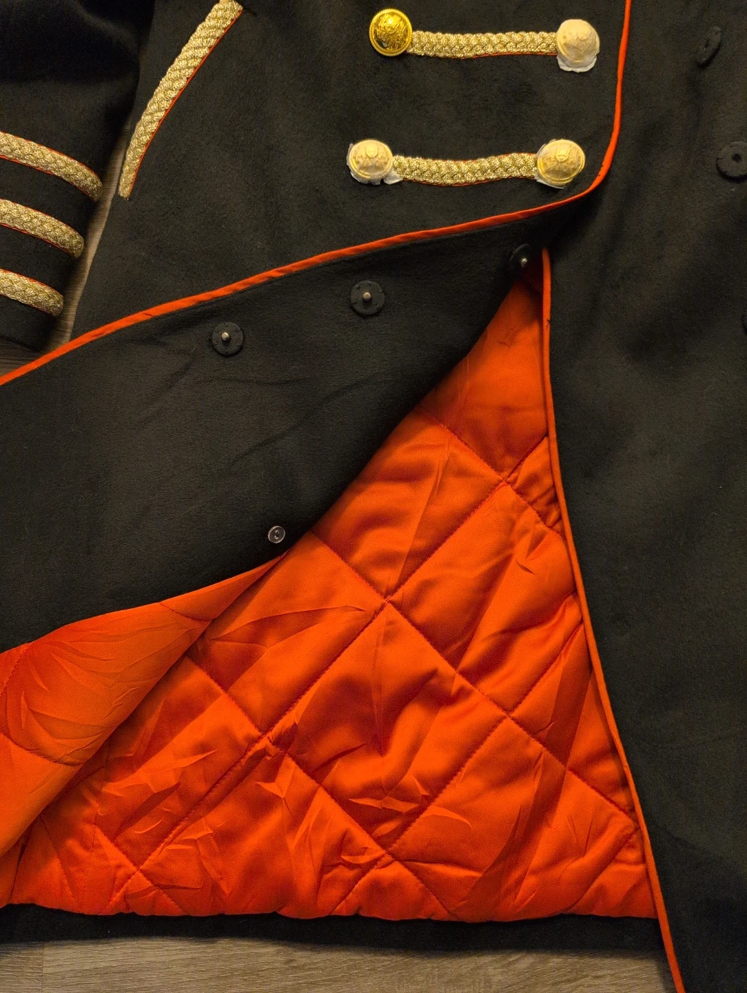 Gold braiding and decorative buttons on the front and cuffs. The coat has a quilted orange lining and a size L.