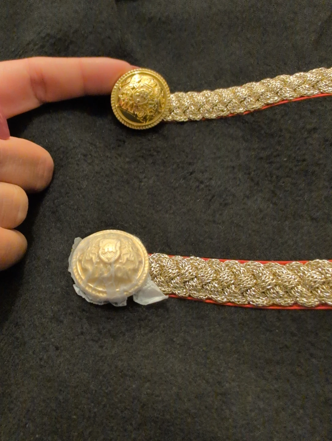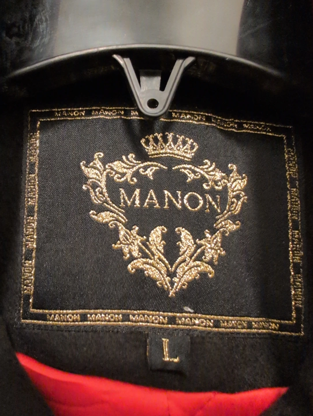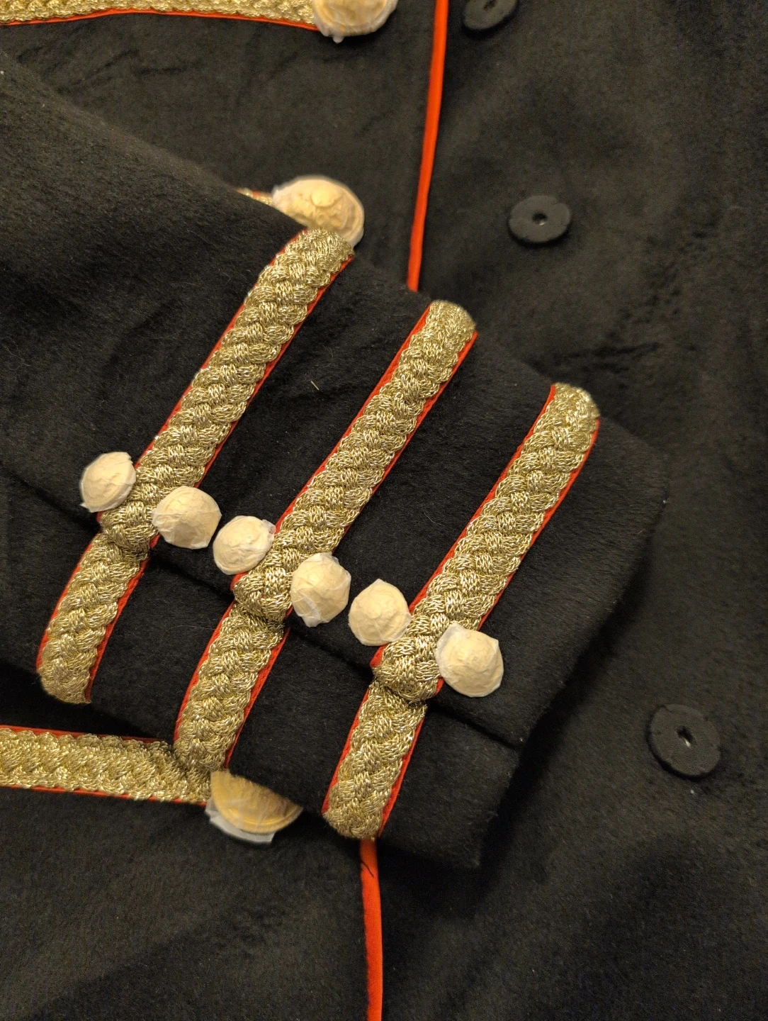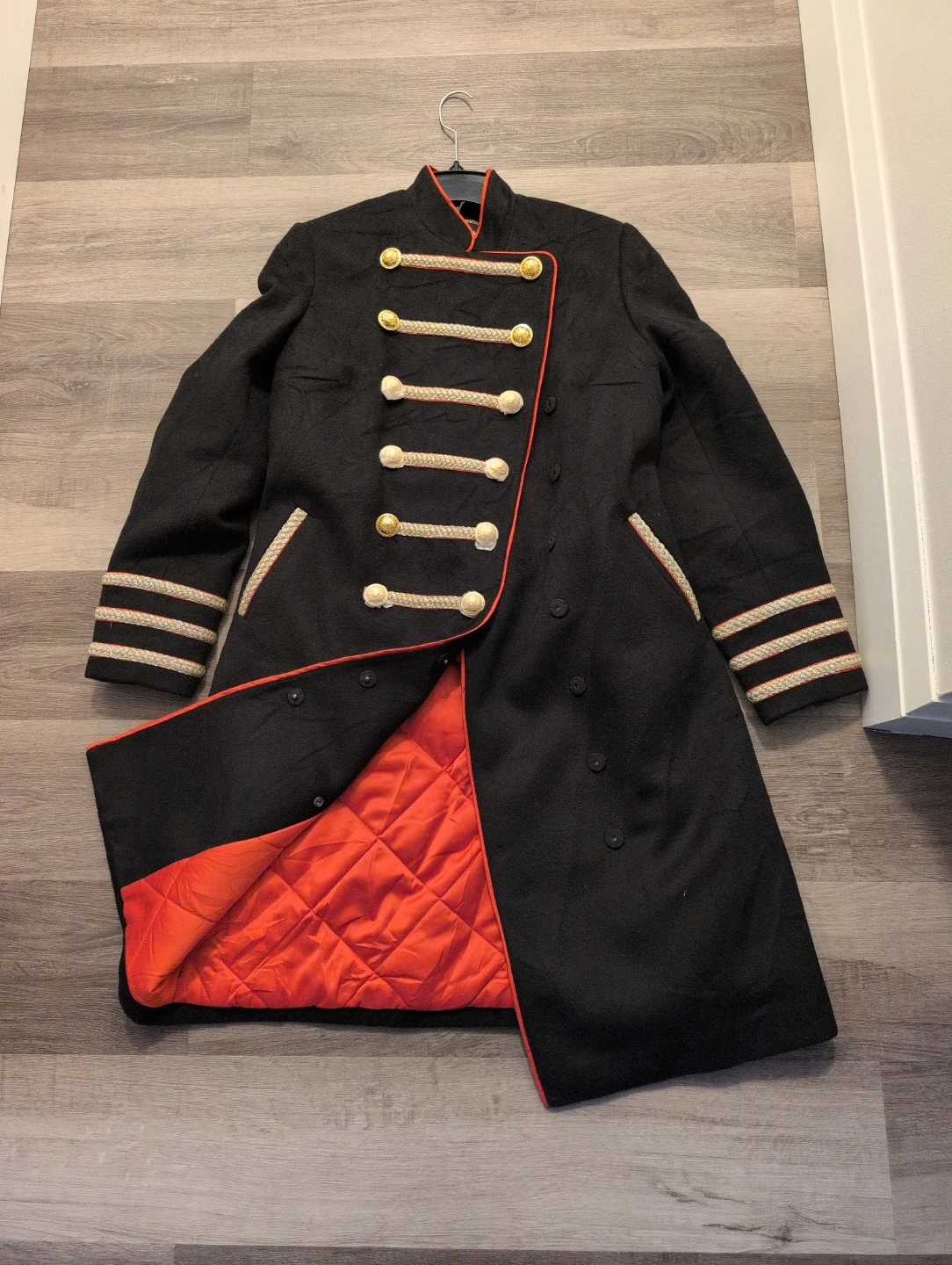 Gold braiding and decorative buttons on the front and cuffs. The coat has a quilted orange lining and a size L.