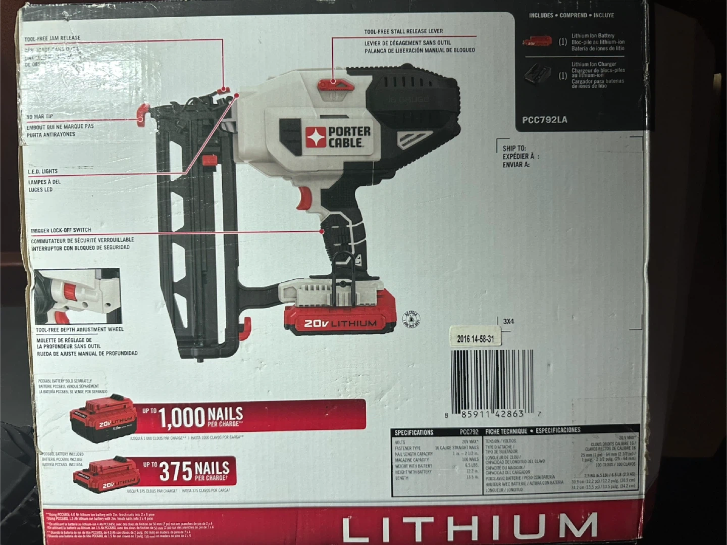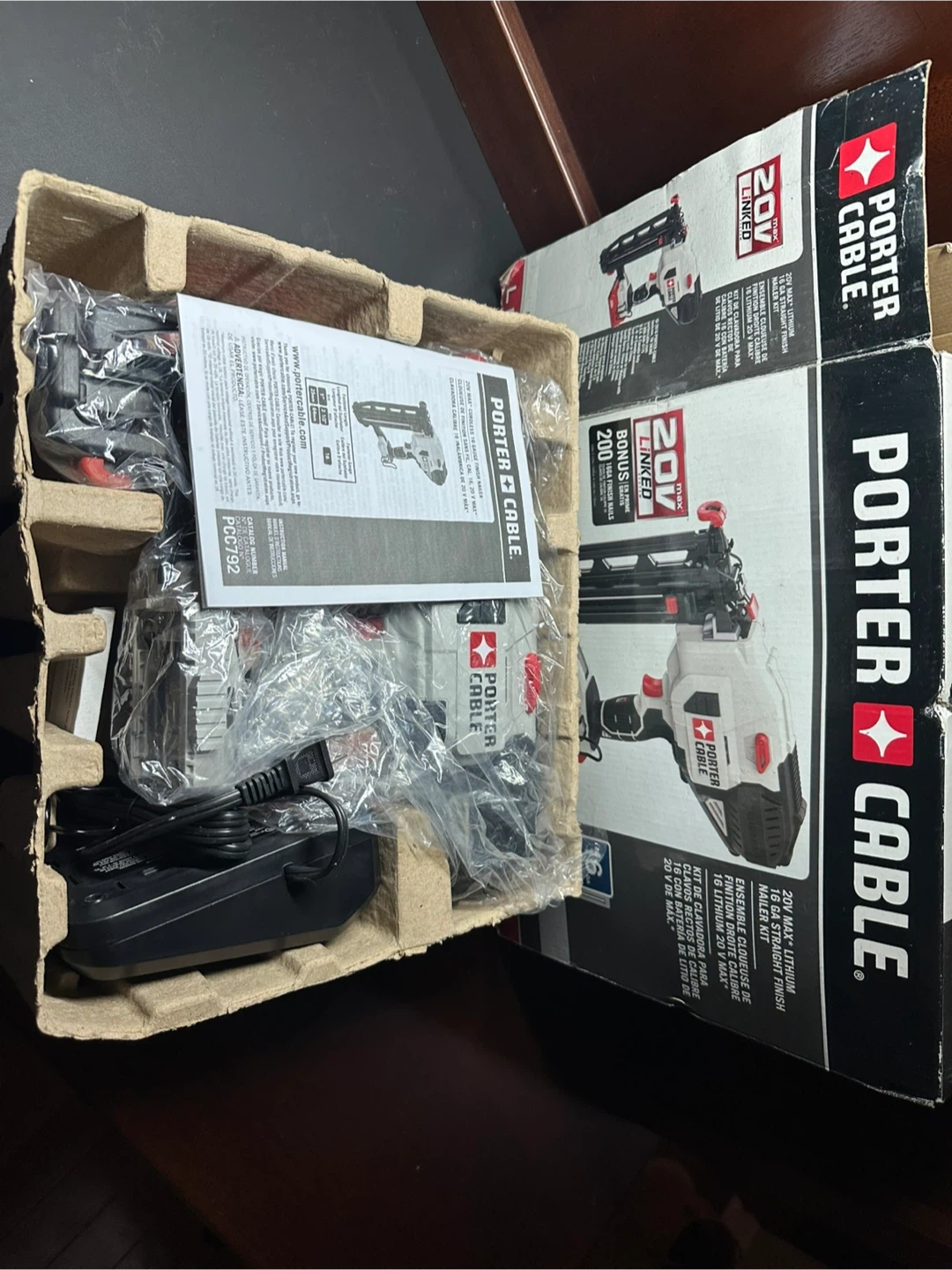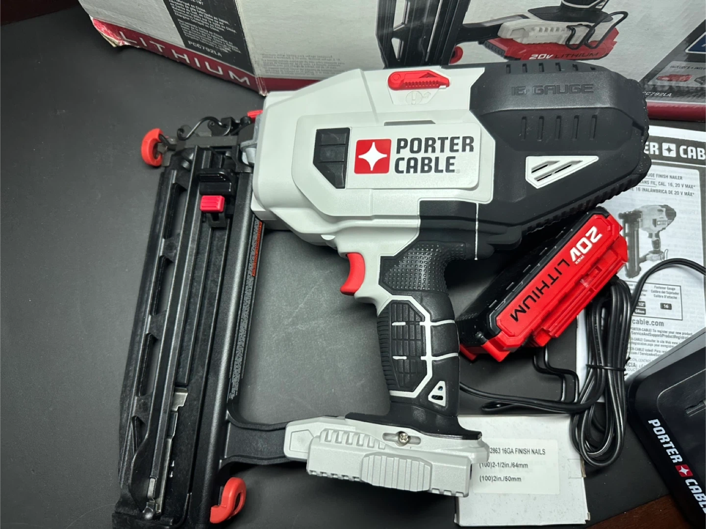 This is a Porter Cable 20V MAX Lithium 18 Gauge Straight Finish Nailer Kit. It includes the nailer, a 20V Lithium battery, a battery charger, and a starter pack of nails. The tool comes with its original box and manual.