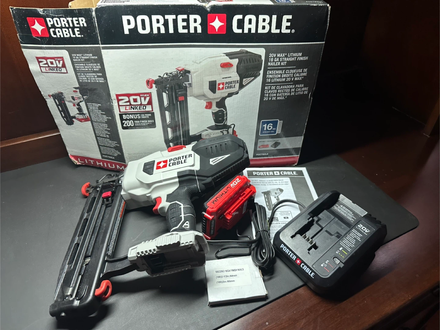 This is a Porter Cable 20V MAX Lithium 18 Gauge Straight Finish Nailer Kit. It includes the nailer, a 20V Lithium battery, a battery charger, and a starter pack of nails. The tool comes with its original box and manual.