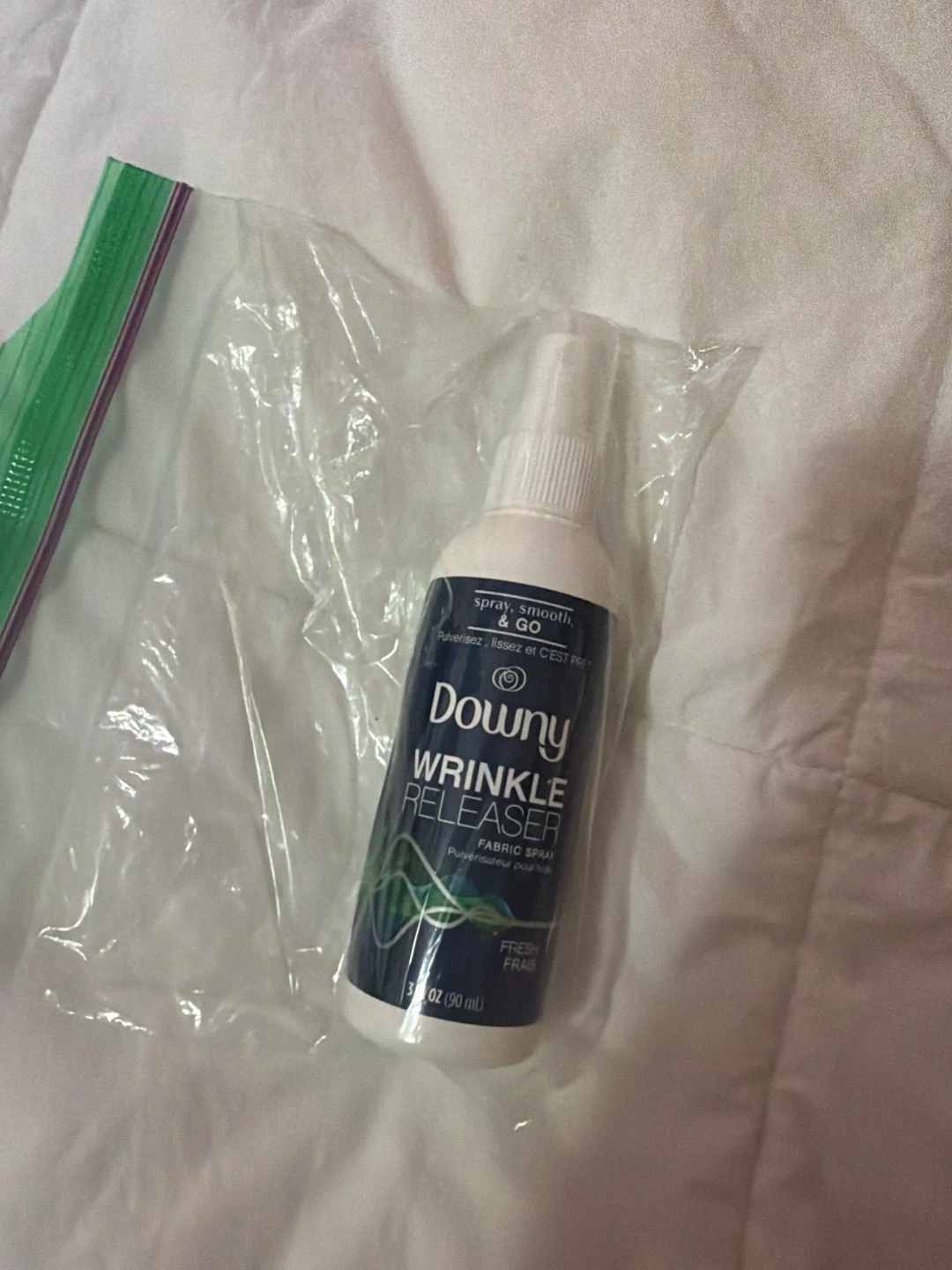 Only used once. Downy Wrinkle Releaser Fabric Spray in Fresh scent. It's a 3 oz (90 ml) bottle. This spray is great for smoothing out wrinkles on the go!