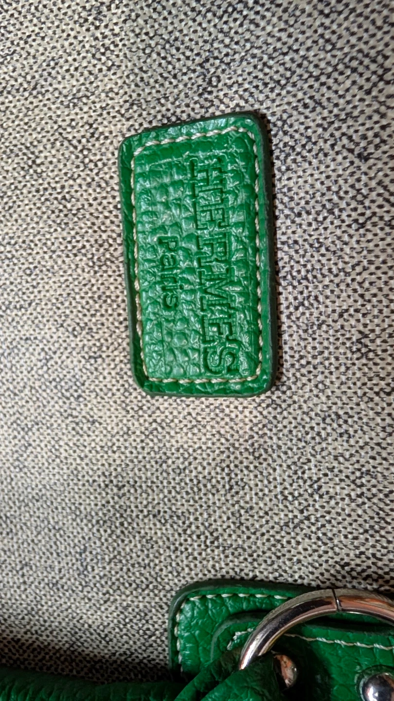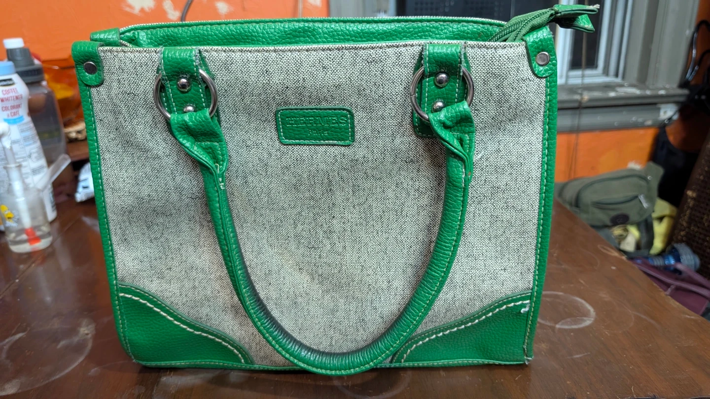 Stylish green and grey handbag from Hermes Paris. It's made with a textured fabric and leather accents. This bag features a zippered main compartment and durable handles. Replica