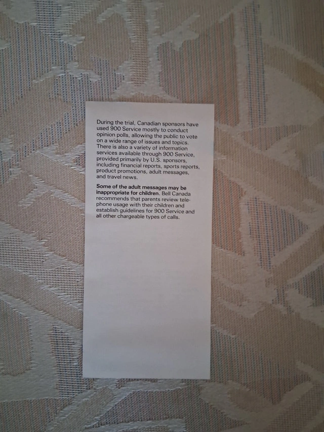 Buy & SellVintage 1986 Bell Canada "900 Service" Notice FlyerVintage 1986 Bell Canada "900 Service" Notice Flyer$6Available for pickup/public meetup in Mississauga. Cash and E Transfer accepted.WHERE TO MEETBud Gregory Boulevard & Gatineau AvenueView MapSELLERRobert EHurontario717 reviews0 chats·0 favorites·1 viewsSEND CHAT TO SELLERHi Robert E! I’m interested in your listing.Hi Robert E! I’m interested in your listing.Get the Karrot app to chatSign In to chat