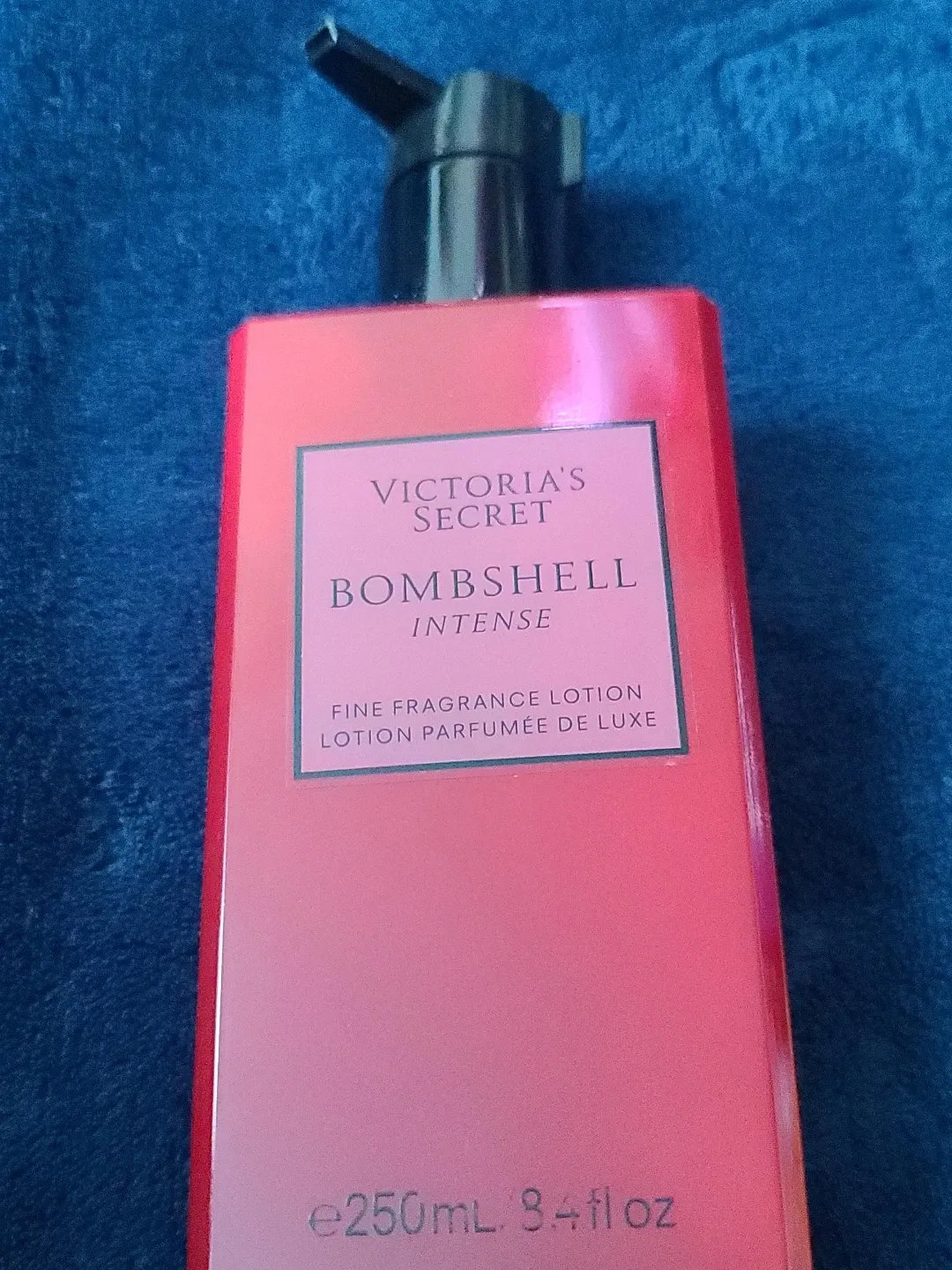 Victoria's Secret Bombshell Intense fine fragrance lotion. It's a 250mL (8.4 fl oz) bottle. This lotion is perfect for keeping your skin moisturized with a lovely scent!
