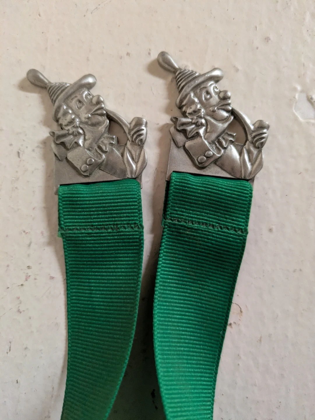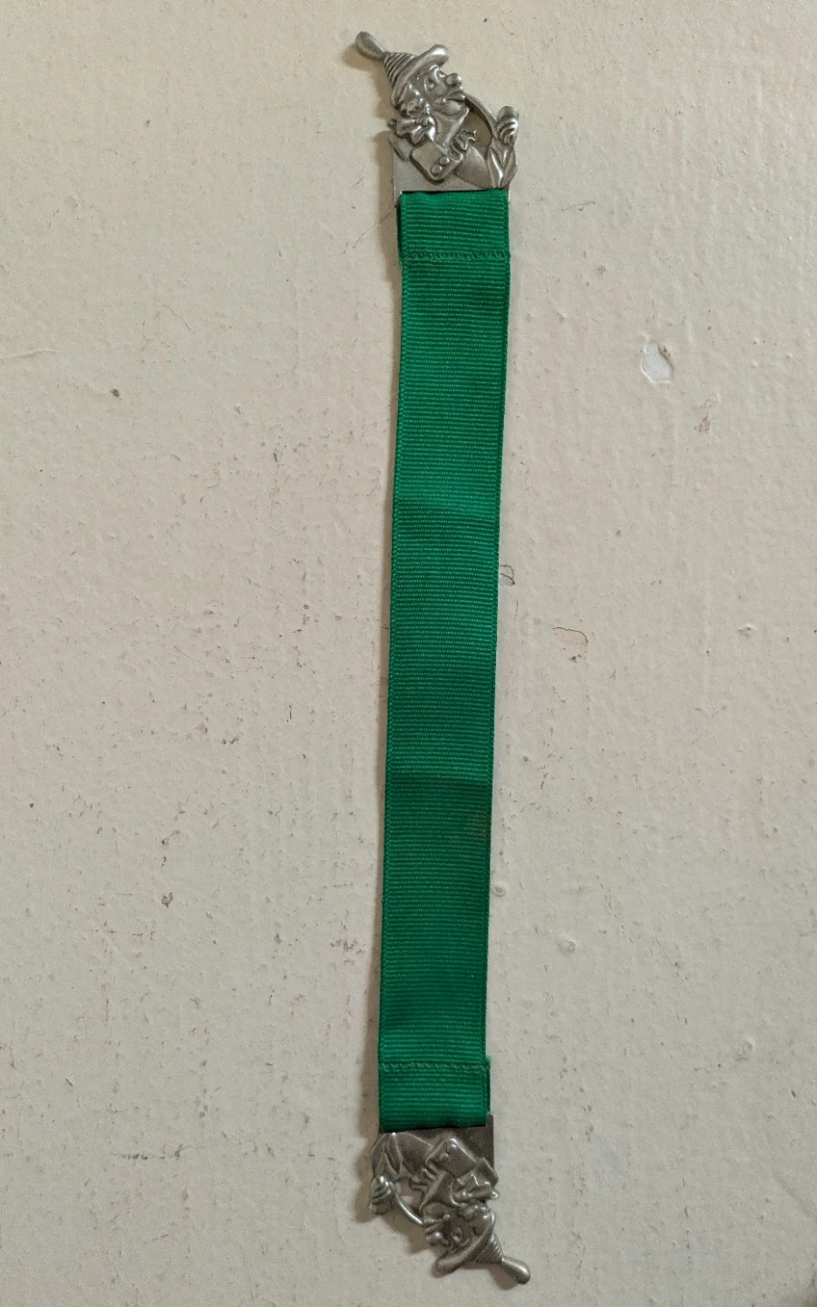 This unique Selwin Pewter bookmark features a detailed metal charm attached to a vibrant green ribbon. The charm depicts a whimsical character. Like a clown. It's perfect for keeping your place in any book! Measures 11.5" x 1" inch