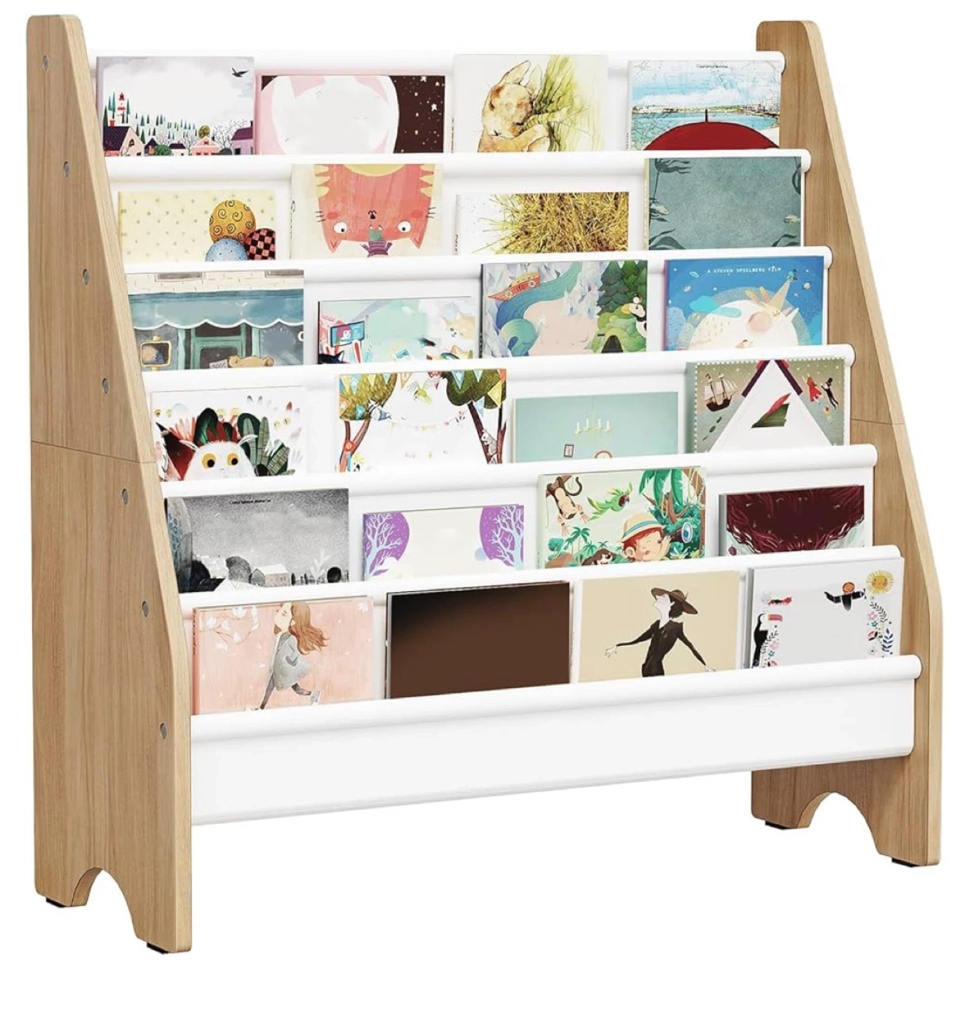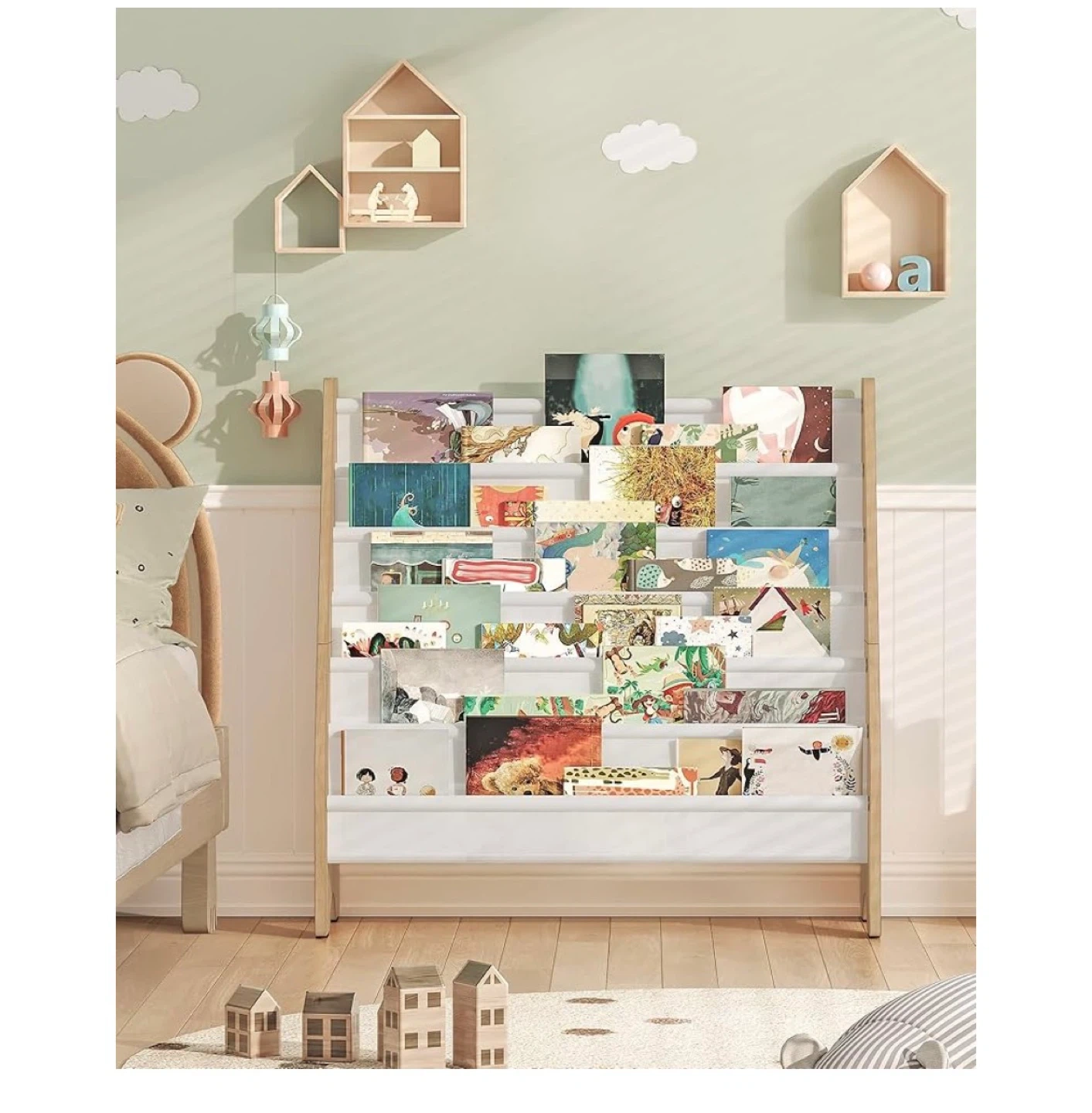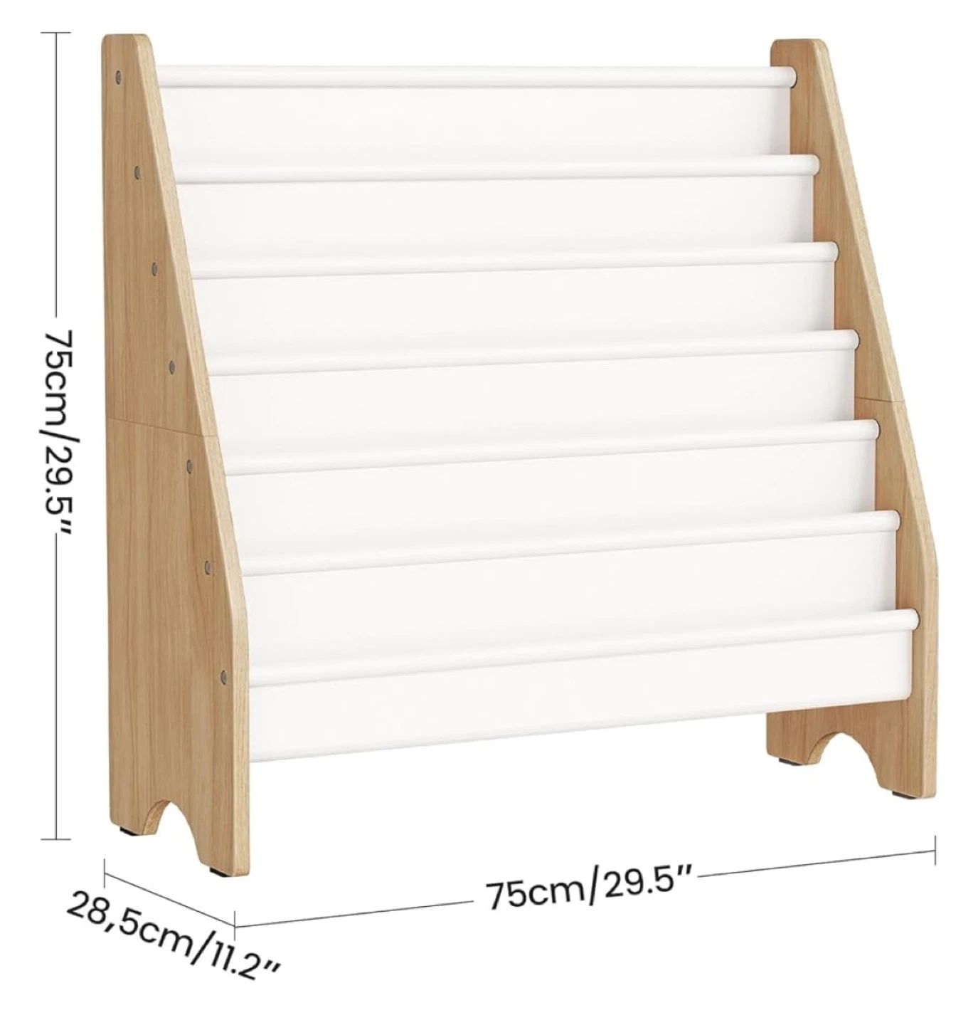 This 6-tier sling book rack offers ample book storage with a widened and deepened design. It's 75cm high, 75cm wide, and 28.5cm deep, perfect for organizing children's books. Keeps books tidy and accessible for little ones!