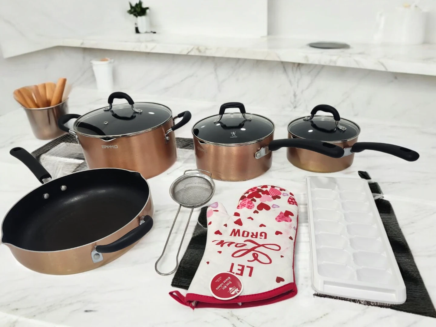 This cookware set features a beautiful copper finish. It includes pots, pans, and a frying pan with glass lids. It's suitable for everyday cooking tasks. The set comes with a strainer and an oven mitt too!