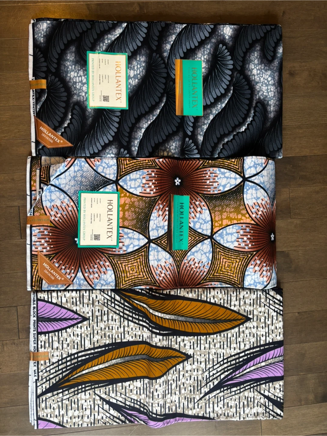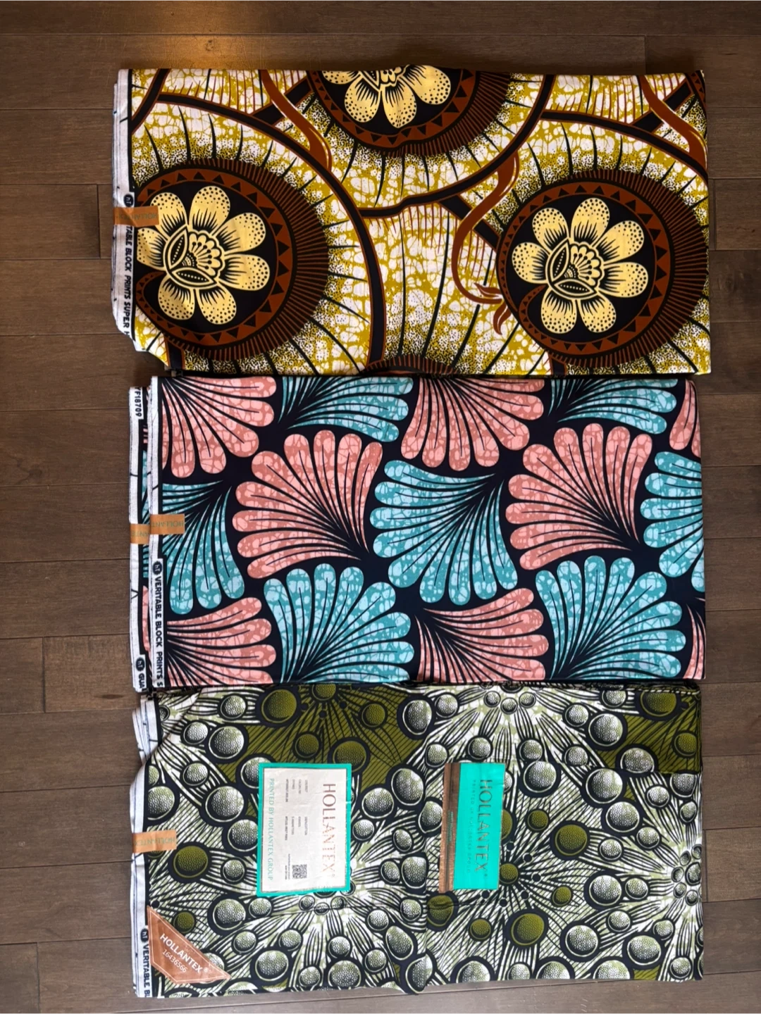 This is a bundle of six yards of HOLLANTEX African print fabric. It features vibrant, colourful patterns ideal for sewing projects. The fabric is 100% cotton.