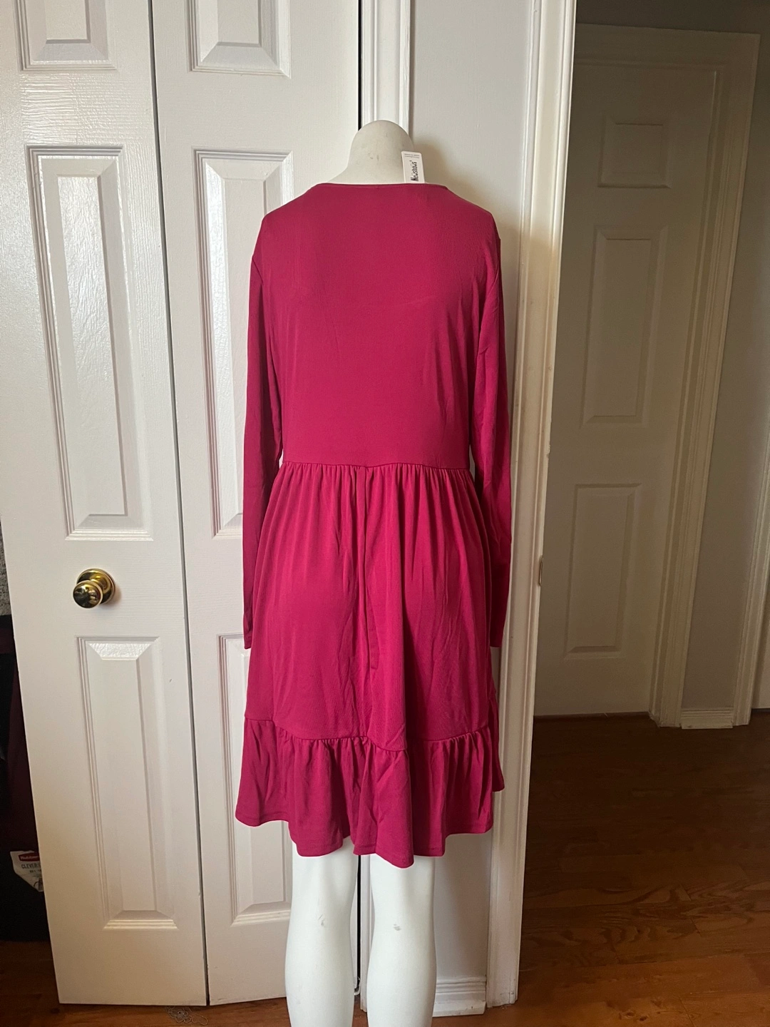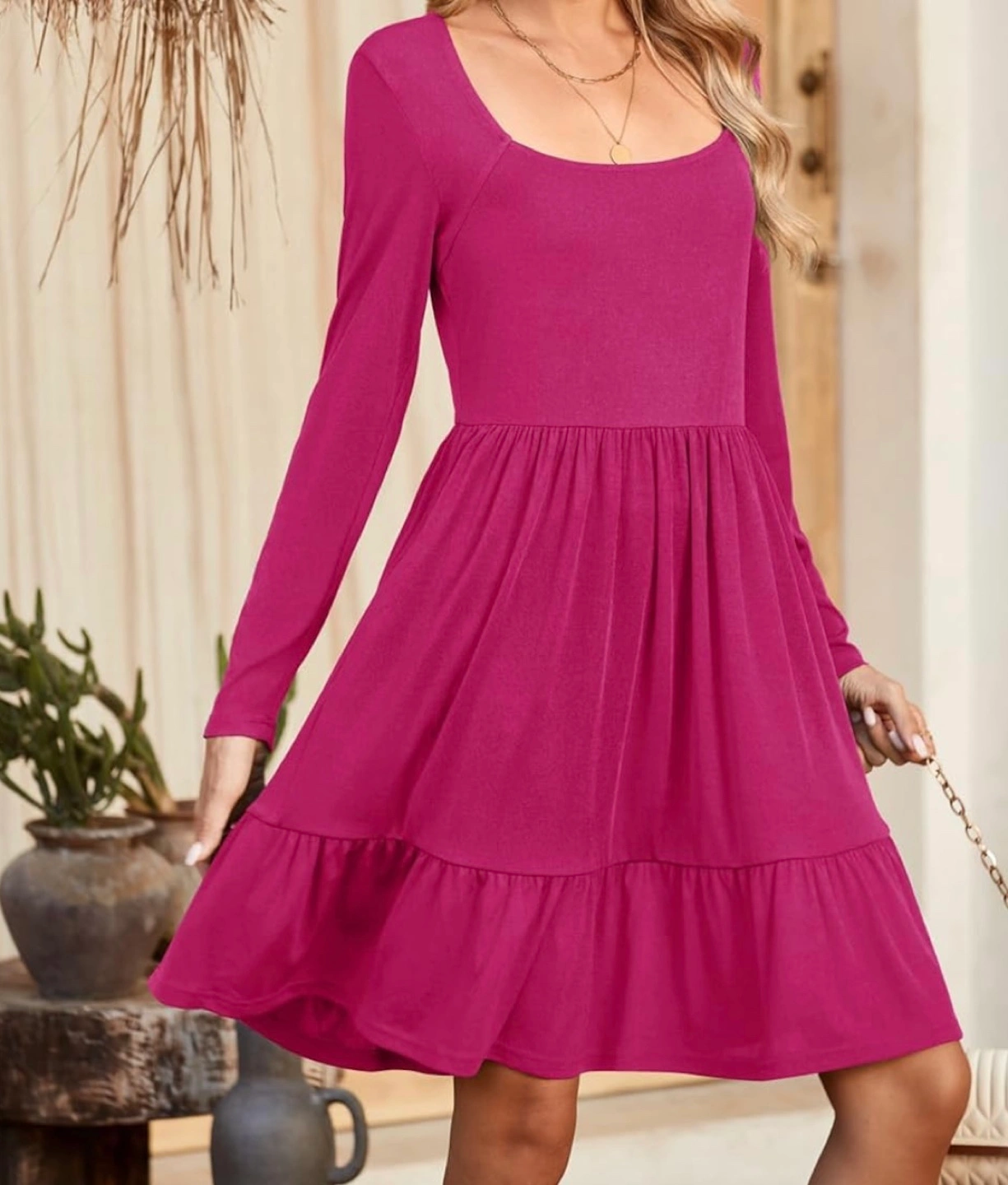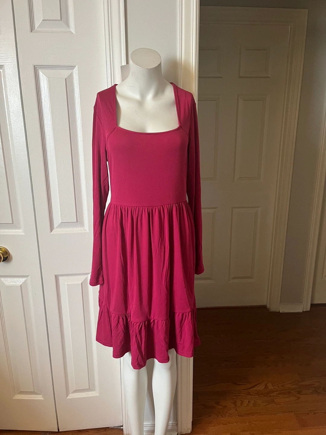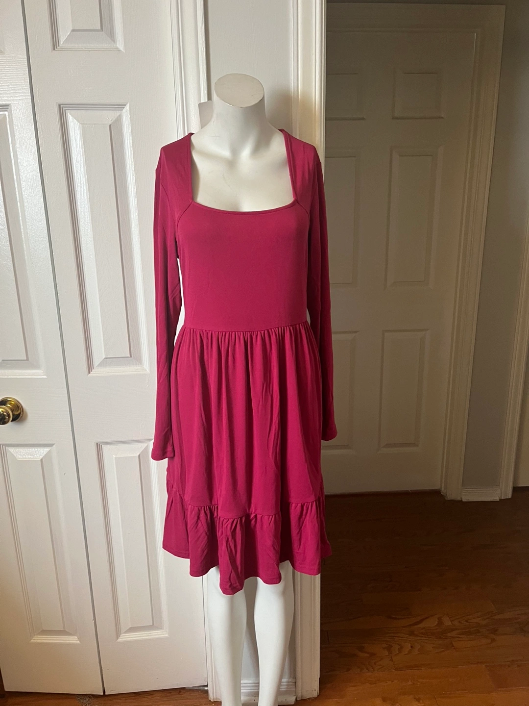 This Newshows dress features long sleeves and a tiered ruffle hem. It's a size XL with a comfortable fit. The square neckline adds a stylish touch.