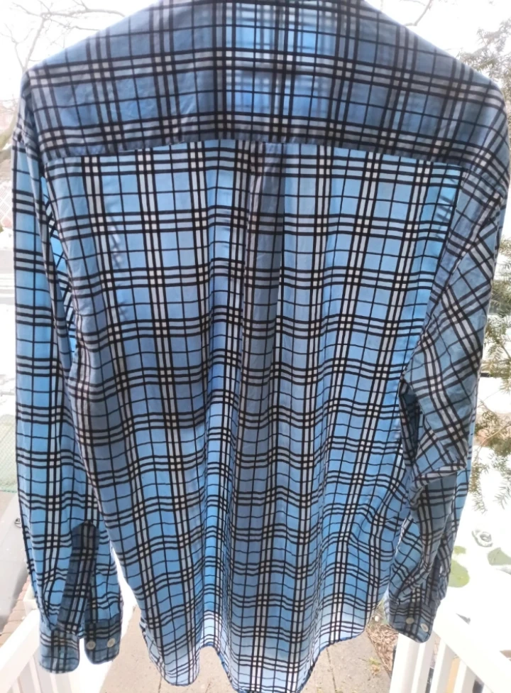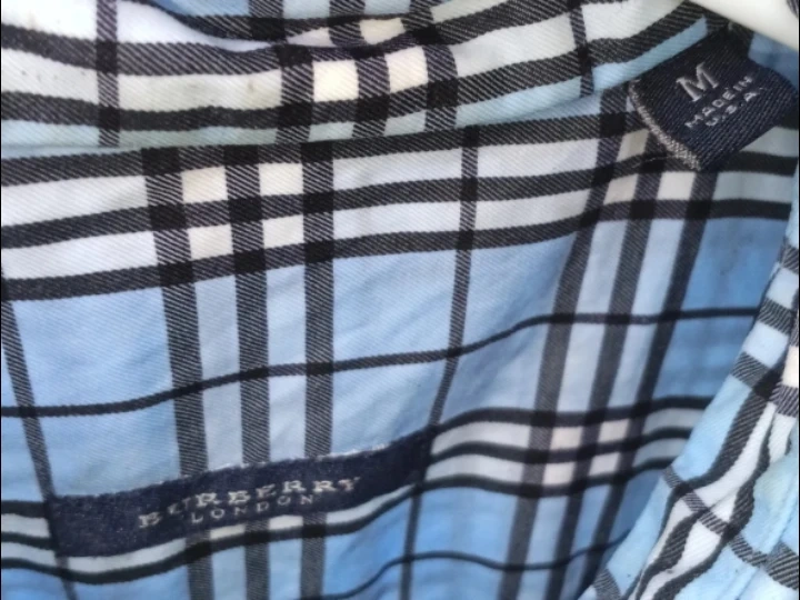 Burberry London button-down shirt in a classic plaid pattern. Size medium. Made in USA. It's a stylish addition to any wardrobe!