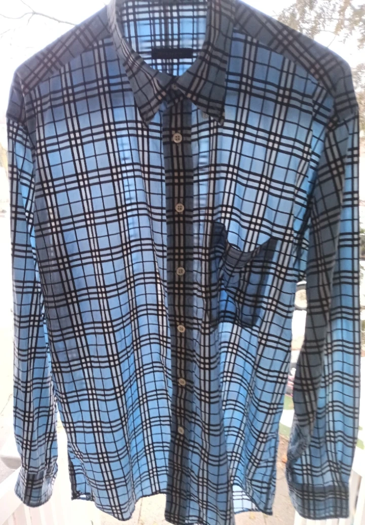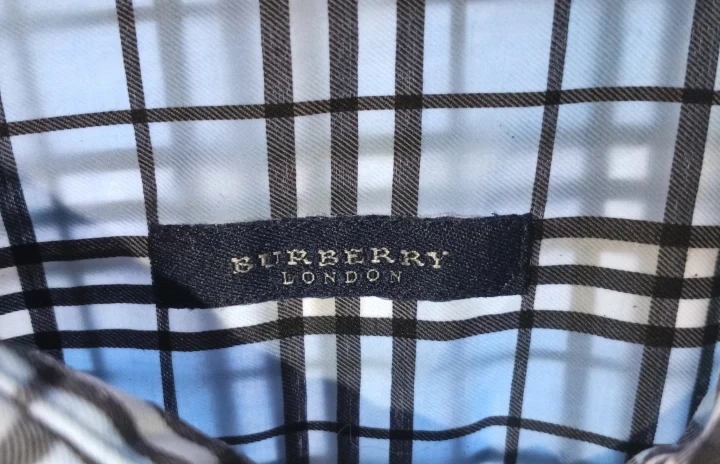 Burberry London button-down shirt in a classic plaid pattern. Size medium. Made in USA. It's a stylish addition to any wardrobe!