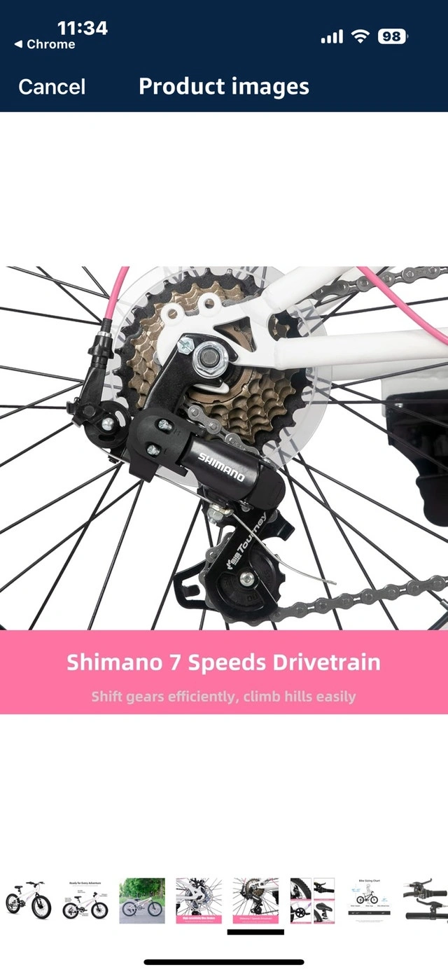 JOYSTAR Minifat 20 Inch Fat Tire bike for kids, designed for children aged 7-13 years. Features a steel frame, wider fat tires, and dual handbrakes, great for cruising on uneven terrain. Suggested rider height is 48 to 60 inches. Excellent shifting with a Shimano rear derailleur and 7 speeds, making hills easier to climb. Twist shifters provide smooth gear changes. Safer riding with dual disc brakes offering quick response time, non-slip resin pedals with reflectors. The 20 x 3.0 inch knobby mountain fat tires provide excellent stopping power and traction on various surfaces like sand, mud, snow, or pavement. Includes DIY decals for personalization. The bike has a comfortable soft seat. Comes 85% assembled with basic tools. Original retail price was $340 plus taxes. Asking $240 or best offer.