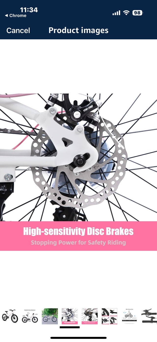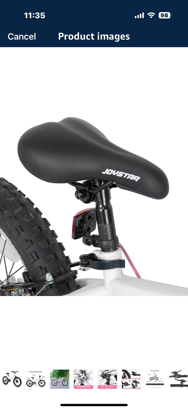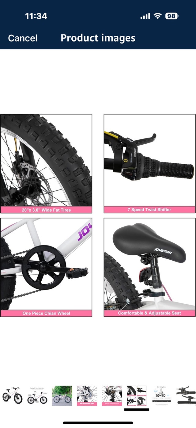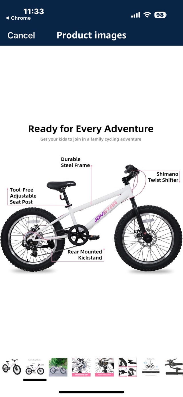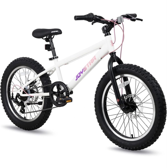 JOYSTAR Minifat 20 Inch Fat Tire bike for kids, designed for children aged 7-13 years. Features a steel frame, wider fat tires, and dual handbrakes, great for cruising on uneven terrain. Suggested rider height is 48 to 60 inches. Excellent shifting with a Shimano rear derailleur and 7 speeds, making hills easier to climb. Twist shifters provide smooth gear changes. Safer riding with dual disc brakes offering quick response time, non-slip resin pedals with reflectors. The 20 x 3.0 inch knobby mountain fat tires provide excellent stopping power and traction on various surfaces like sand, mud, snow, or pavement. Includes DIY decals for personalization. The bike has a comfortable soft seat. Comes 85% assembled with basic tools. Original retail price was $340 plus taxes. Asking $240 or best offer.