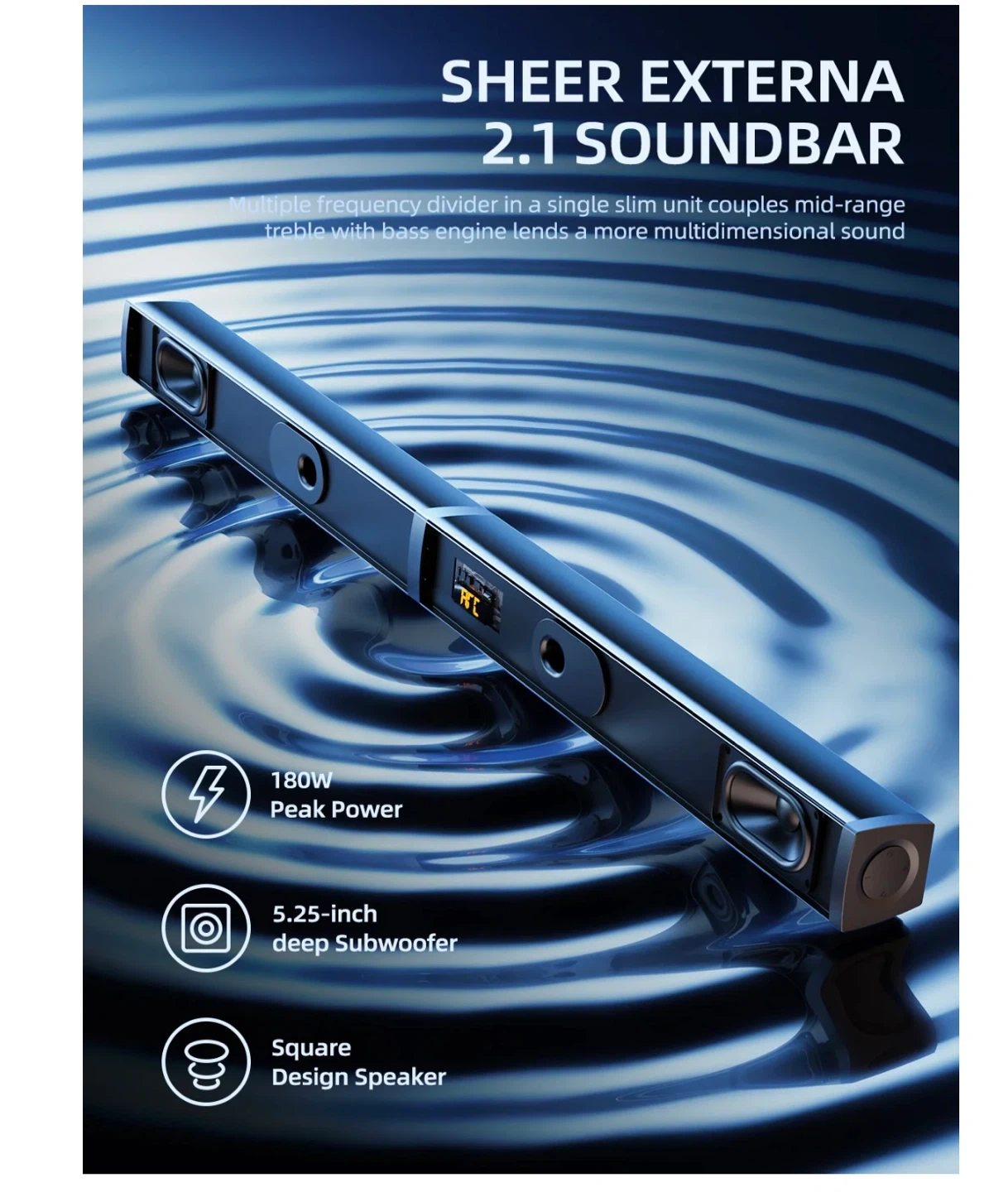 ADVANCED 2.1 SOUND BAR: 180W peak power carrying capacity and rapid refresh rate woofer in the MEREDO go beyond conventional 2.1 ch speaker directivity to let you enjoy the thrill of immersive theater audio in multiple slim units