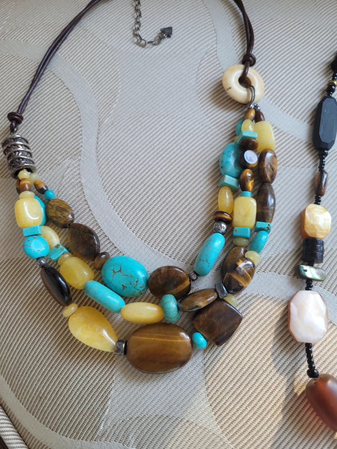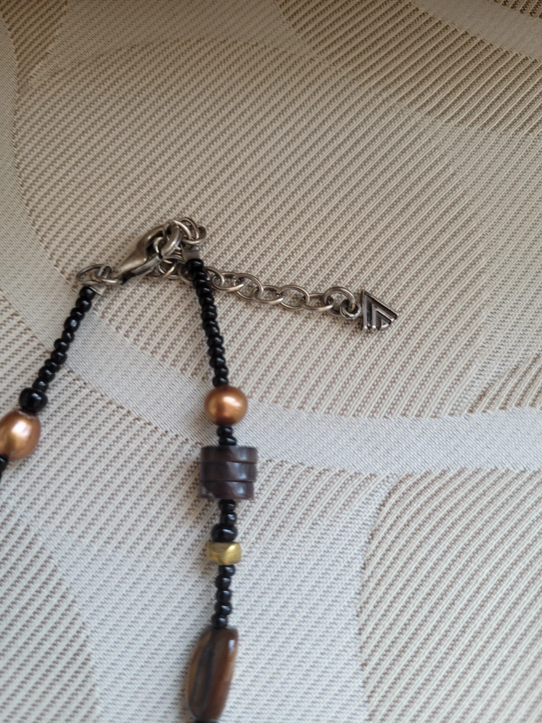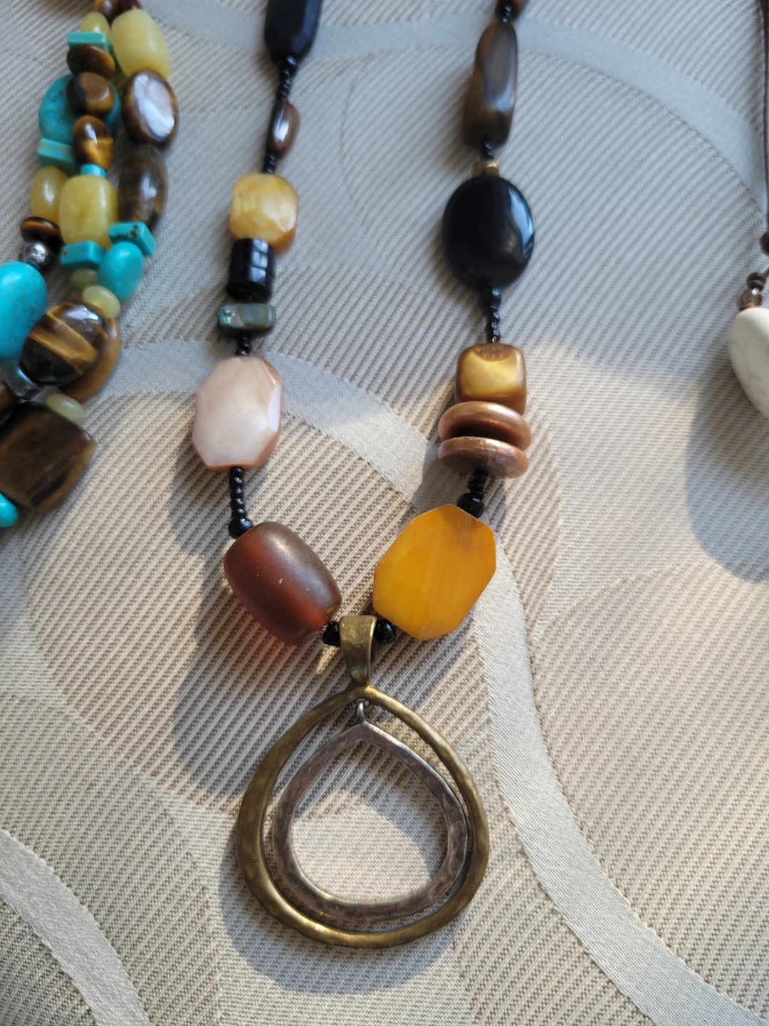 Features unique stones turquoise, tiger's eye, yellow stones, and various wood and shell elements. Includes a lobster clasp and 2' extension chain. All have trademark arrowhead.