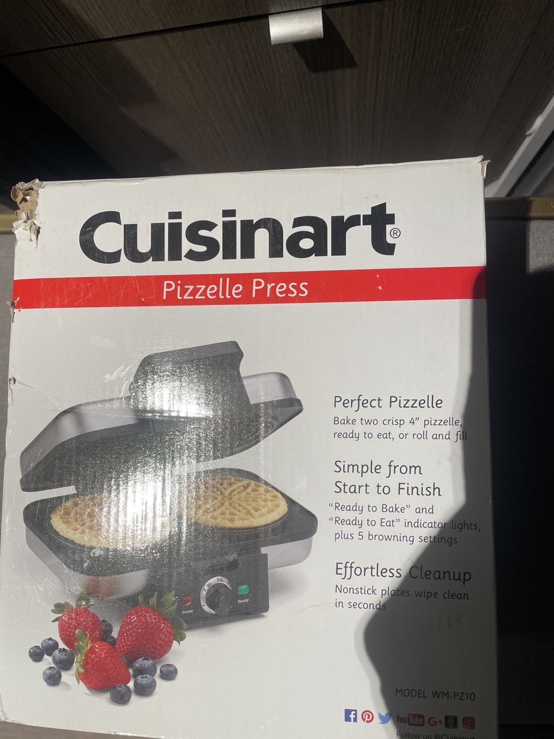 New Cuisinart Pizzelle Press. Model WM-PZ10. Bakes two 4" pizzelle. Easy cleanup. Five browning settings.