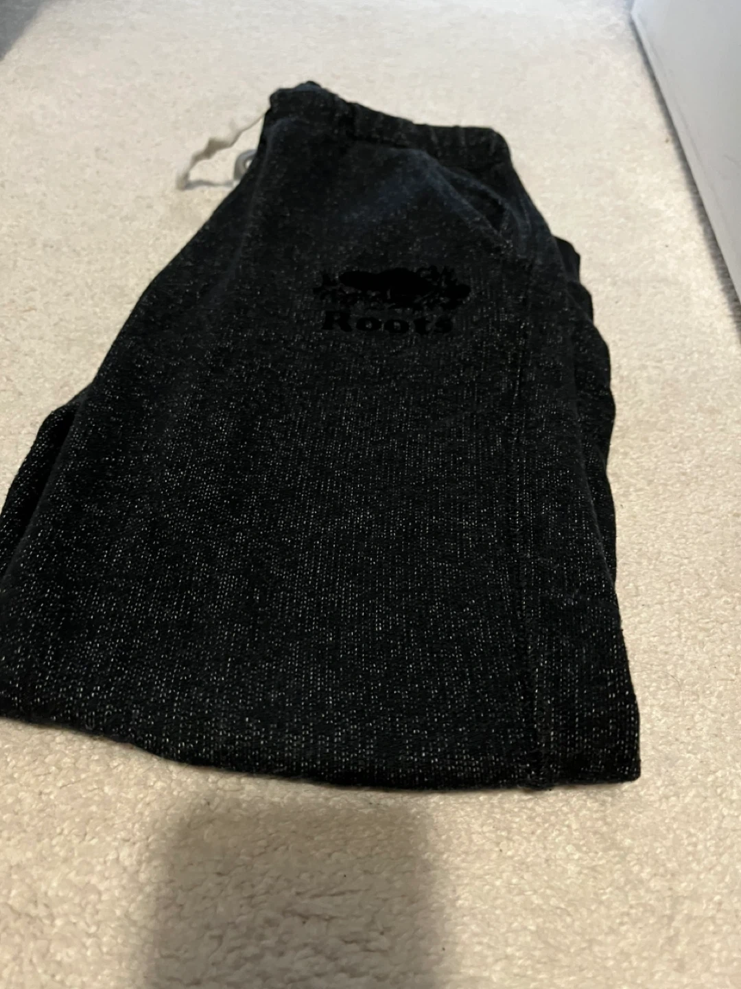 Roots sweatpants in black with a distressed detail on the knee. They're a size 12 kids. Comfortable and casual wear!