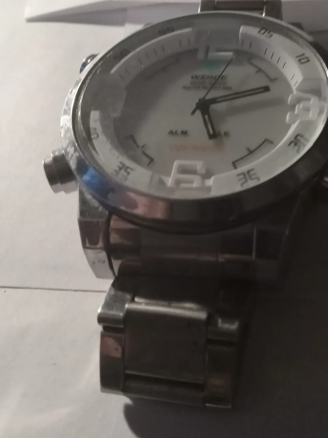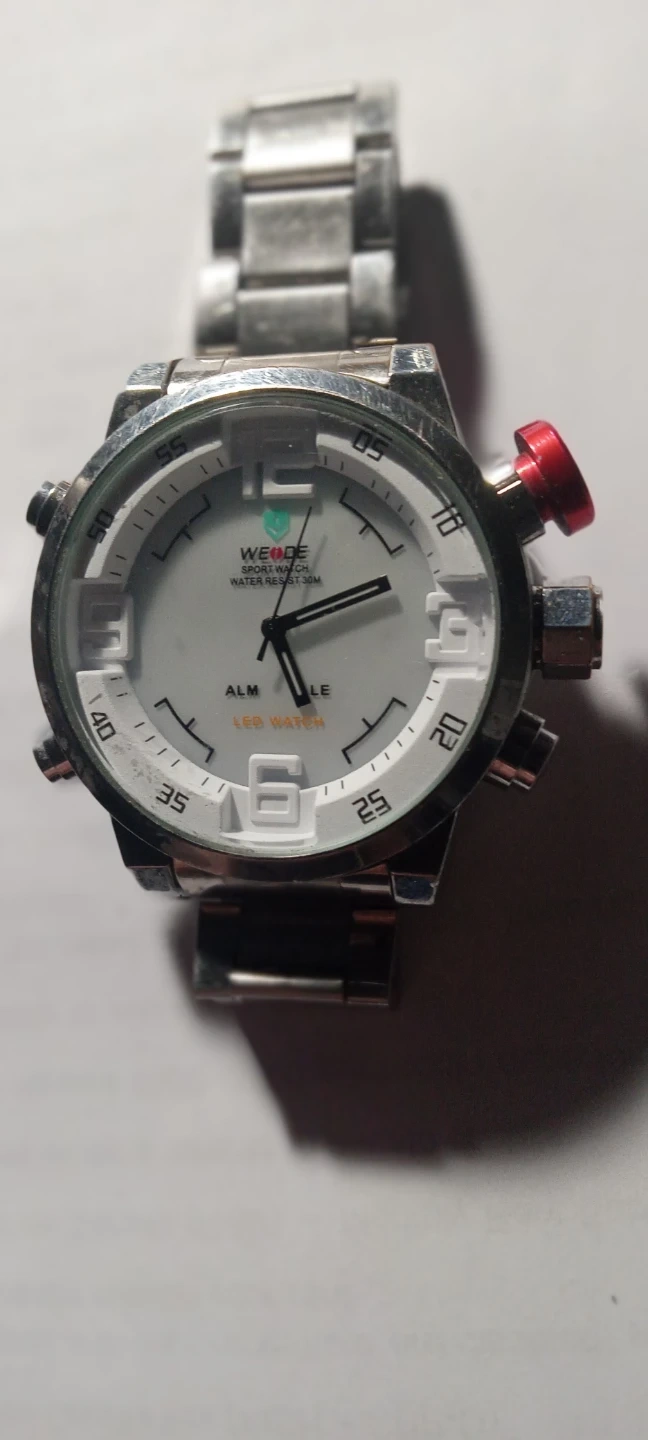 WEIDE watch with analog and digital LED display. Water resistant up to 30 meters. Metal band with white dial color.