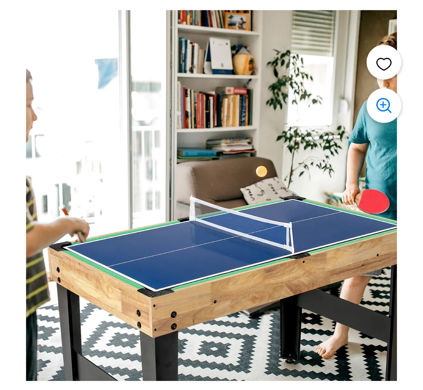 This multifunctional game table offers a wide variety of games for hours of fun. It includes accessories for bowling, shuffle ball, billiards, chess, checkers, hockey, table tennis, foosball, and more. It's a great way to entertain friends and family with its versatile play options!