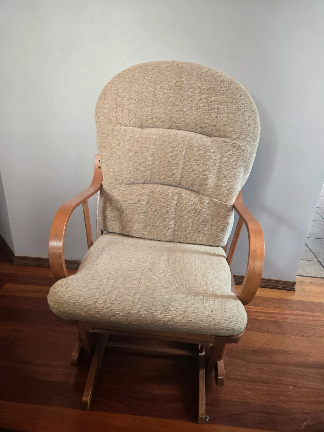 Comfortable glider rocker chair with wooden frame. Upholstered in a textured beige fabric. This chair is designed for gentle rocking motion.