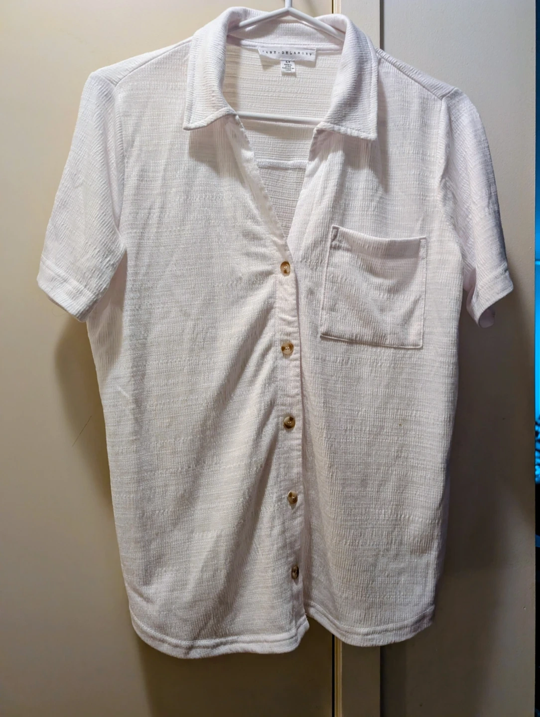 This Jane Delancey short-sleeve shirt features a textured white fabric. It has a classic collar and a single chest pocket. Buttons go all the way down the front.