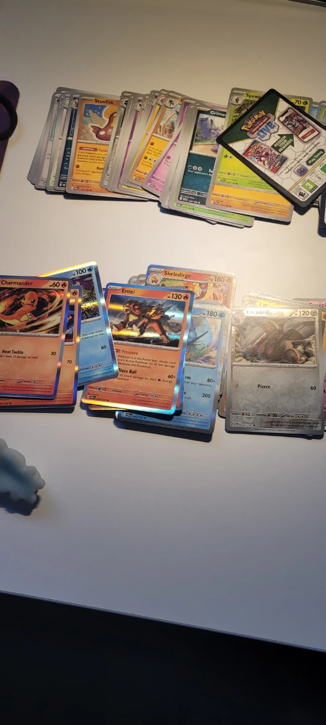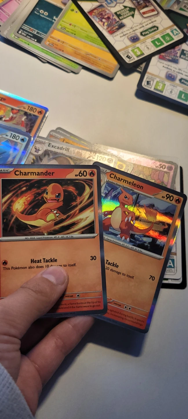 A collection of Pokémon trading cards, including Charmander and Charmeleon. Comes with a Pokémon Trading Card Game tin featuring Gyarados. Great for collectors!