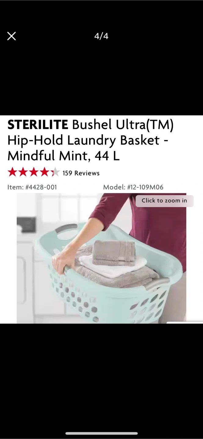 This Sterilite laundry basket holds 44 L. It features hip-hold handles for easy carrying. It's made of plastic and comes in a mindful mint colour.