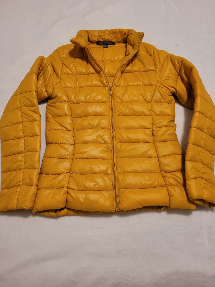 Women's lightweight puffer jacket. Mustard yellow colour. Zip front closure. Long sleeves. XS size. Shows minor stain on one of the sleeve as shown in the last picture