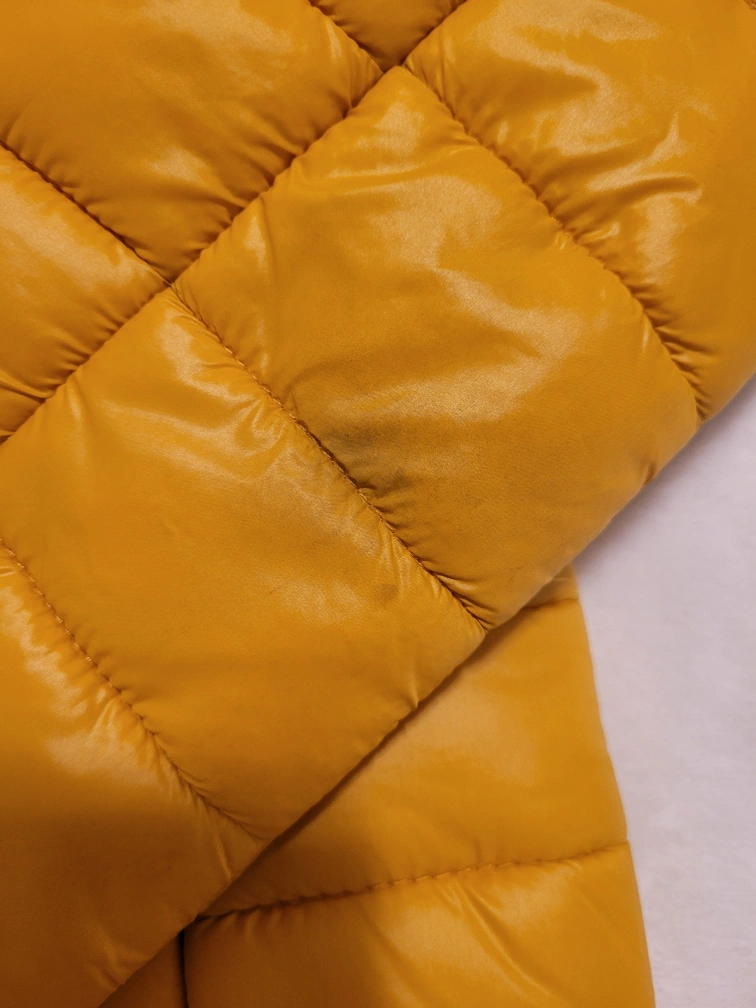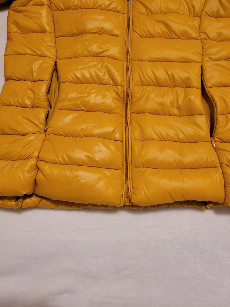 Women's lightweight puffer jacket. Mustard yellow colour. Zip front closure. Long sleeves. XS size. Shows minor stain on one of the sleeve as shown in the last picture