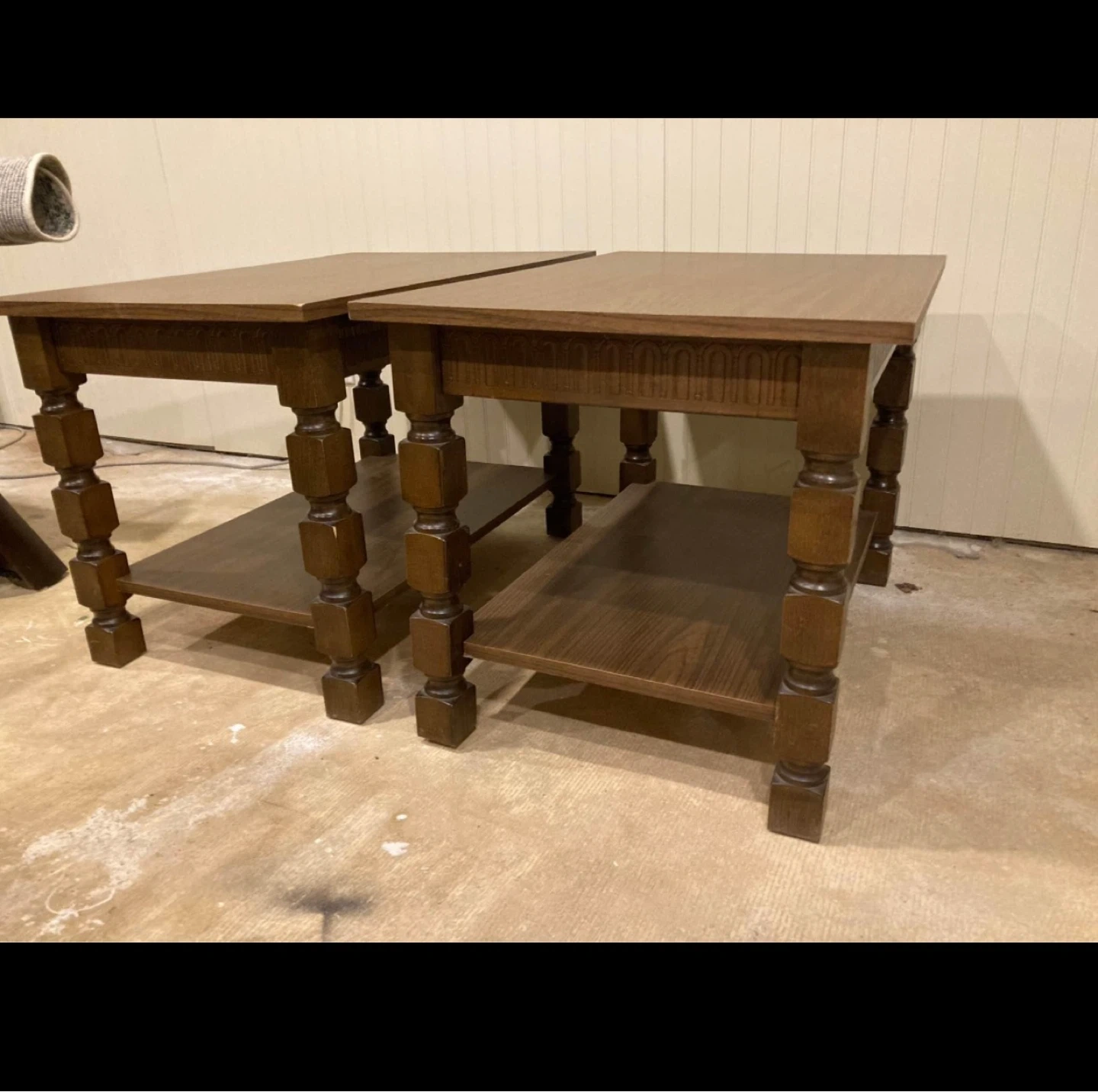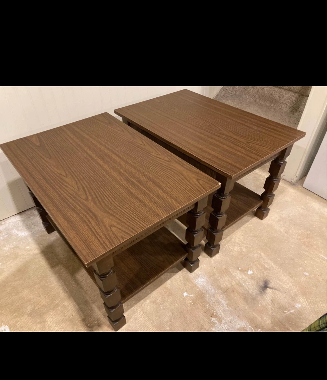 Selling a pair of wooden end tables. These tables feature a dark wood finish and have a lower shelf for extra storage. They're a nice addition to any living room!