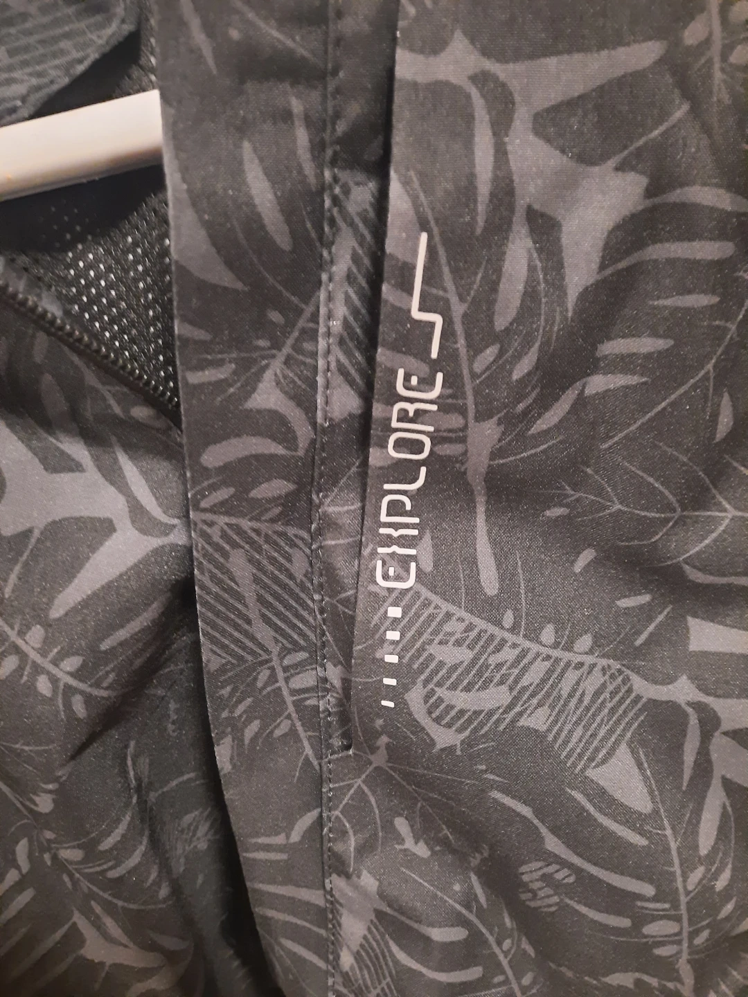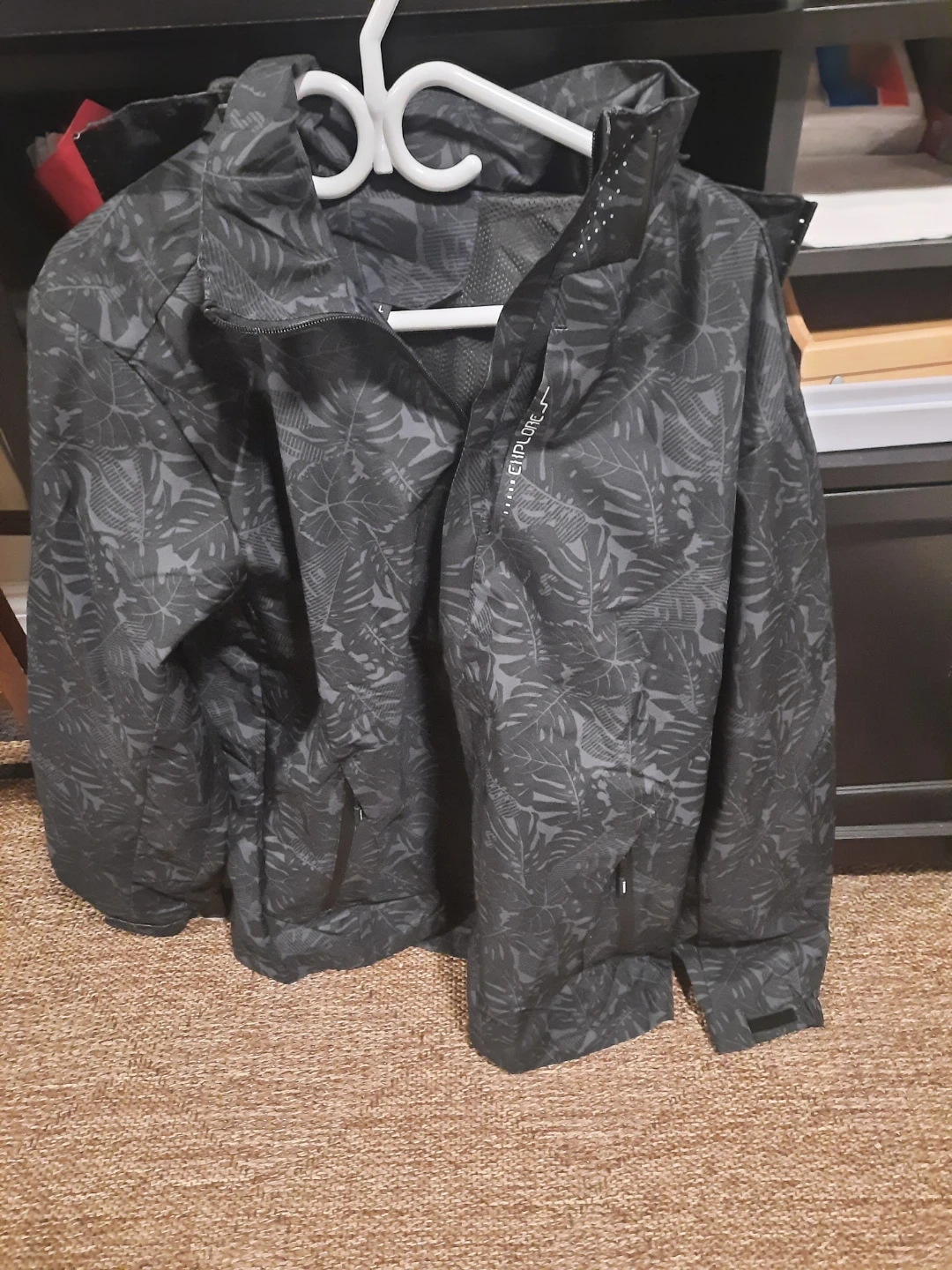This is a lightweight jacket with a dark grey leaf pattern. It's designed for outdoor activities. It features a full zip closure and two front pockets.
