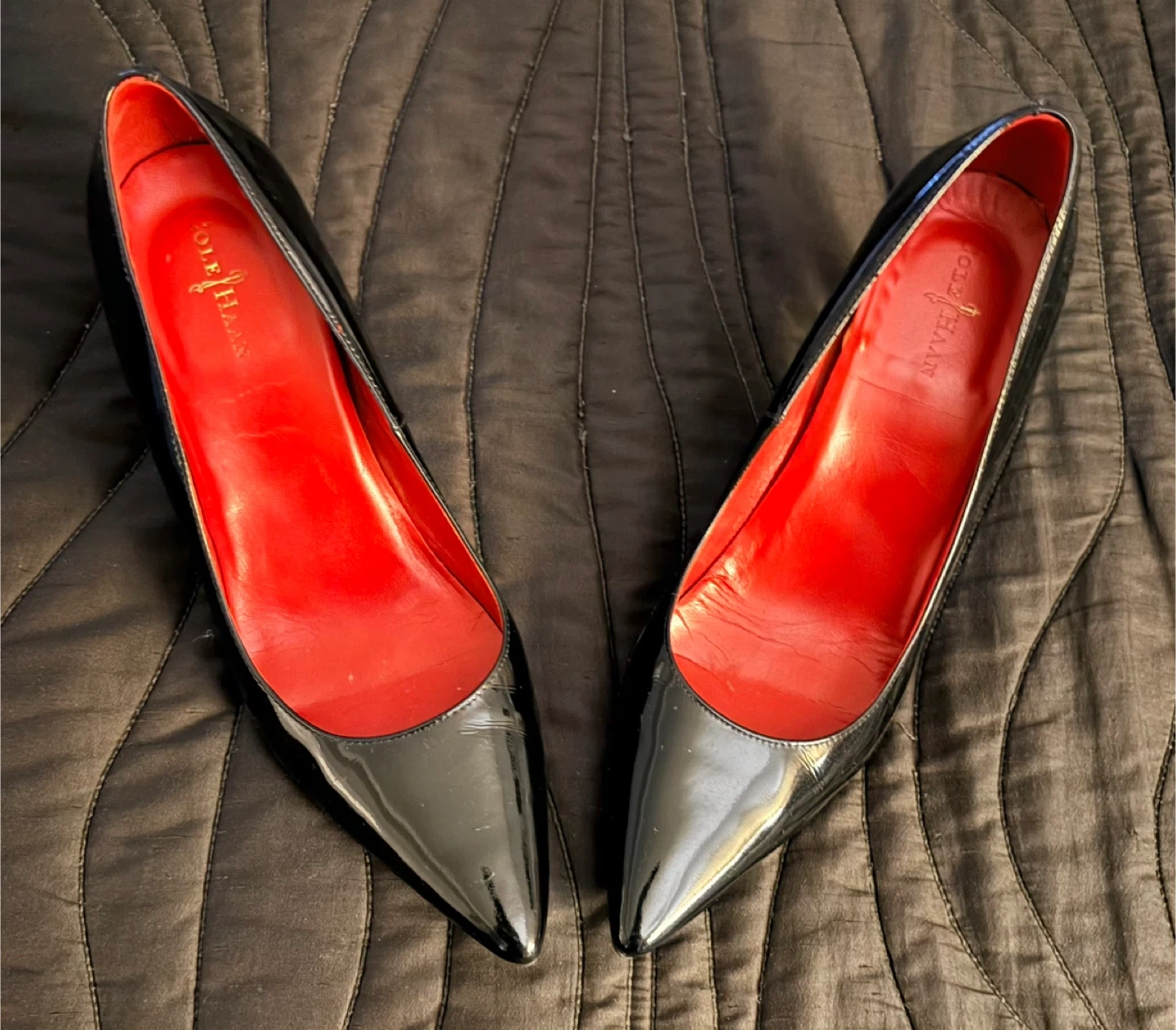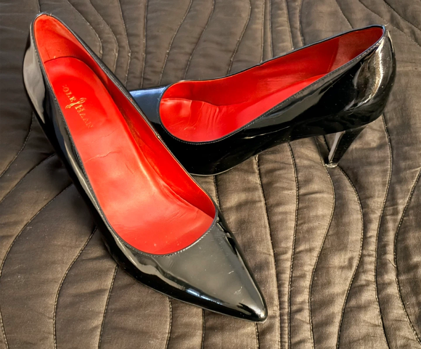 Selling a pair of Cole Haan pumps in size 8B. They're black patent leather with a vibrant red interior. These stylish heels are in great condition and ready for a new home!