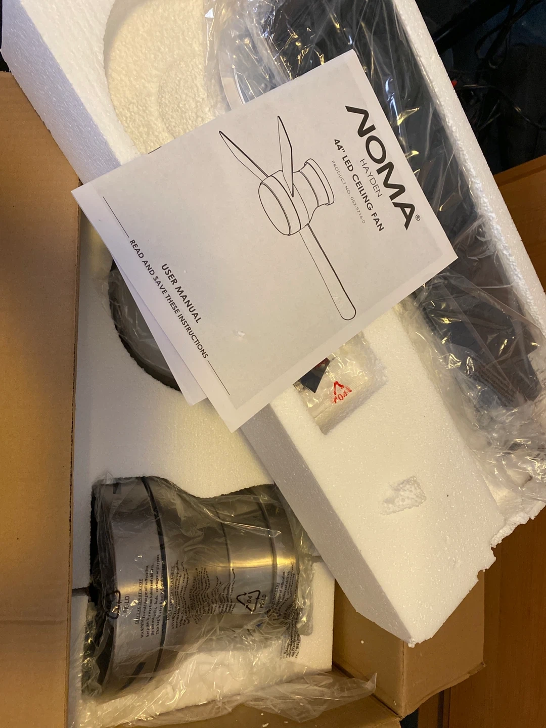 It's a NOMA Hayden 44" LED ceiling fan. Includes user manual. This fan is great for circulating air and providing light in a room.