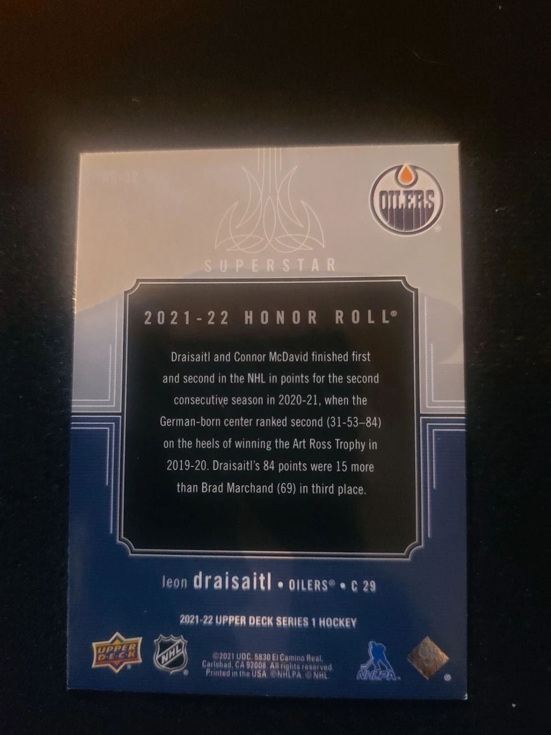This is a 2021-22 Upper Deck Series 1 Honor Roll hockey card featuring Leon Draisaitl. It's a collectible card for fans of the Edmonton Oilers. The card celebrates Draisaitl's performance during the 2020-21 season.