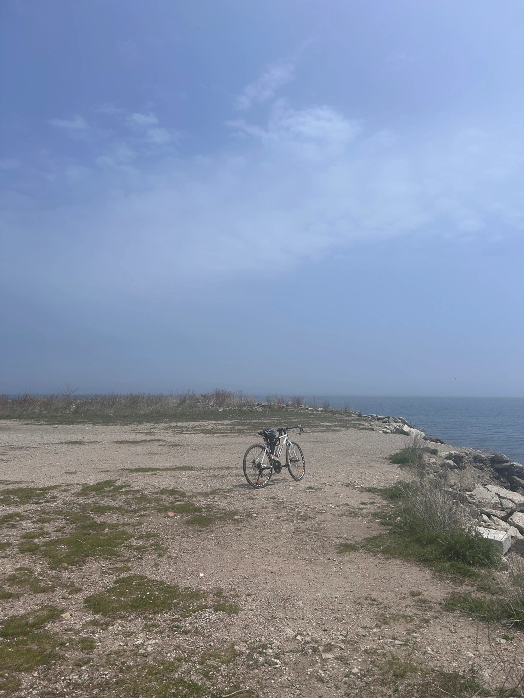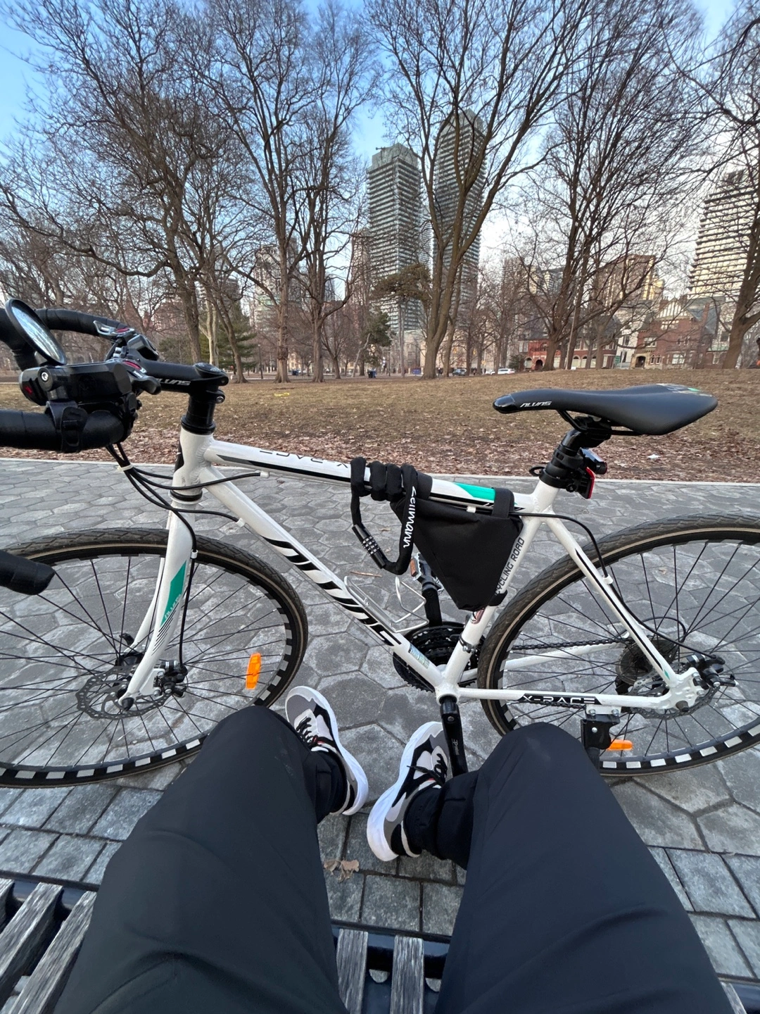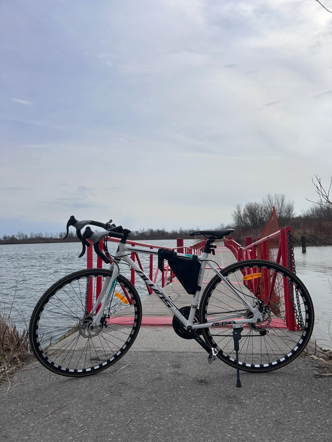 A white road bike with a black seat. It has drop handlebars, a pouch(extra $) attached to the frame, and black and white wheels. Take this bike out for a relaxing ride and enjoy the scenery. If you want lights(front and back, plus u lock, i can add it for 50$ more)