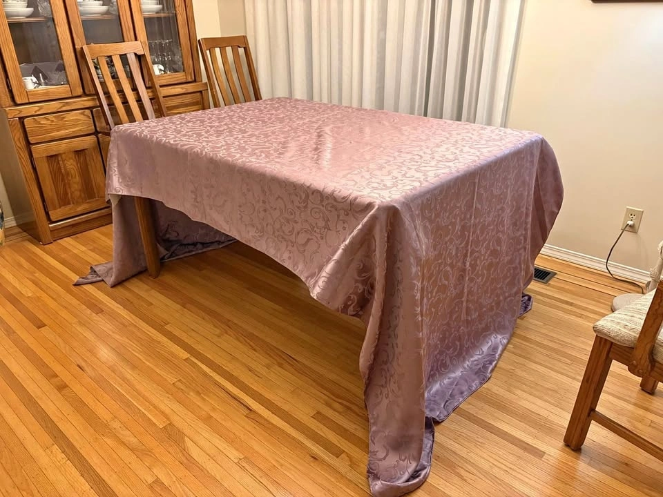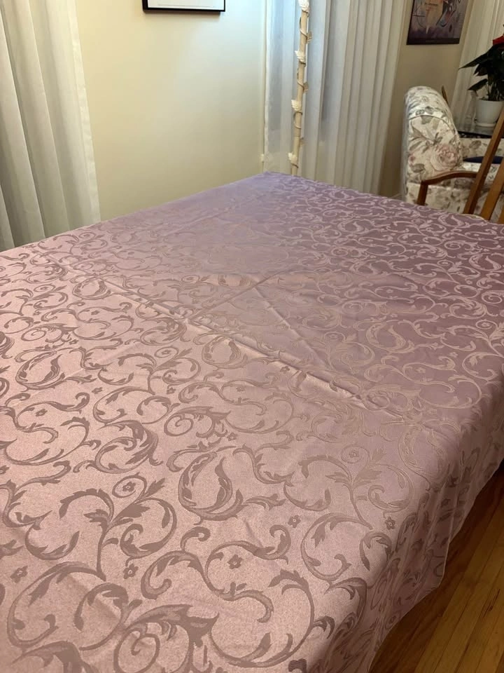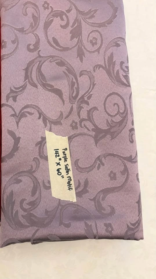 Beautiful purple satin motif tablecloth. It is 142 inches by 60 inches. This size seats 8-10 people. Pick up in Coquitlam. Discounts if you buy 1 more item from my listings.