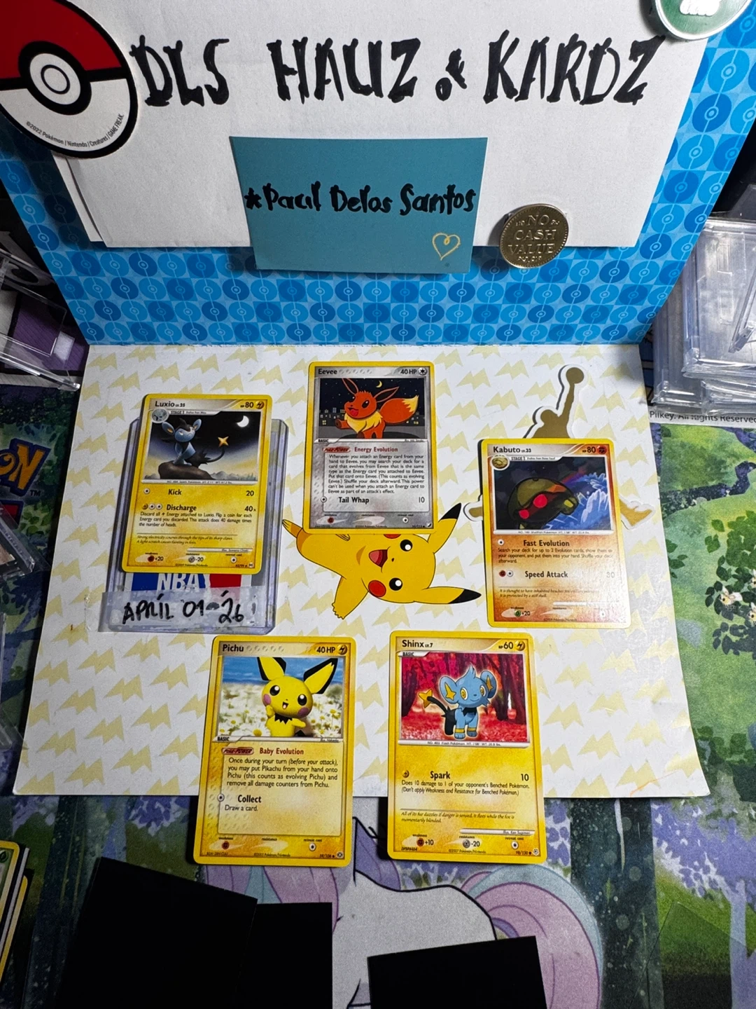 Collection of assorted Pokemon trading cards, including Pikachu, Eevee, Shinx, Kabuto, and Luxio. These cards are from the Pokemon franchise. Perfect for any Pokemon fan or collector!