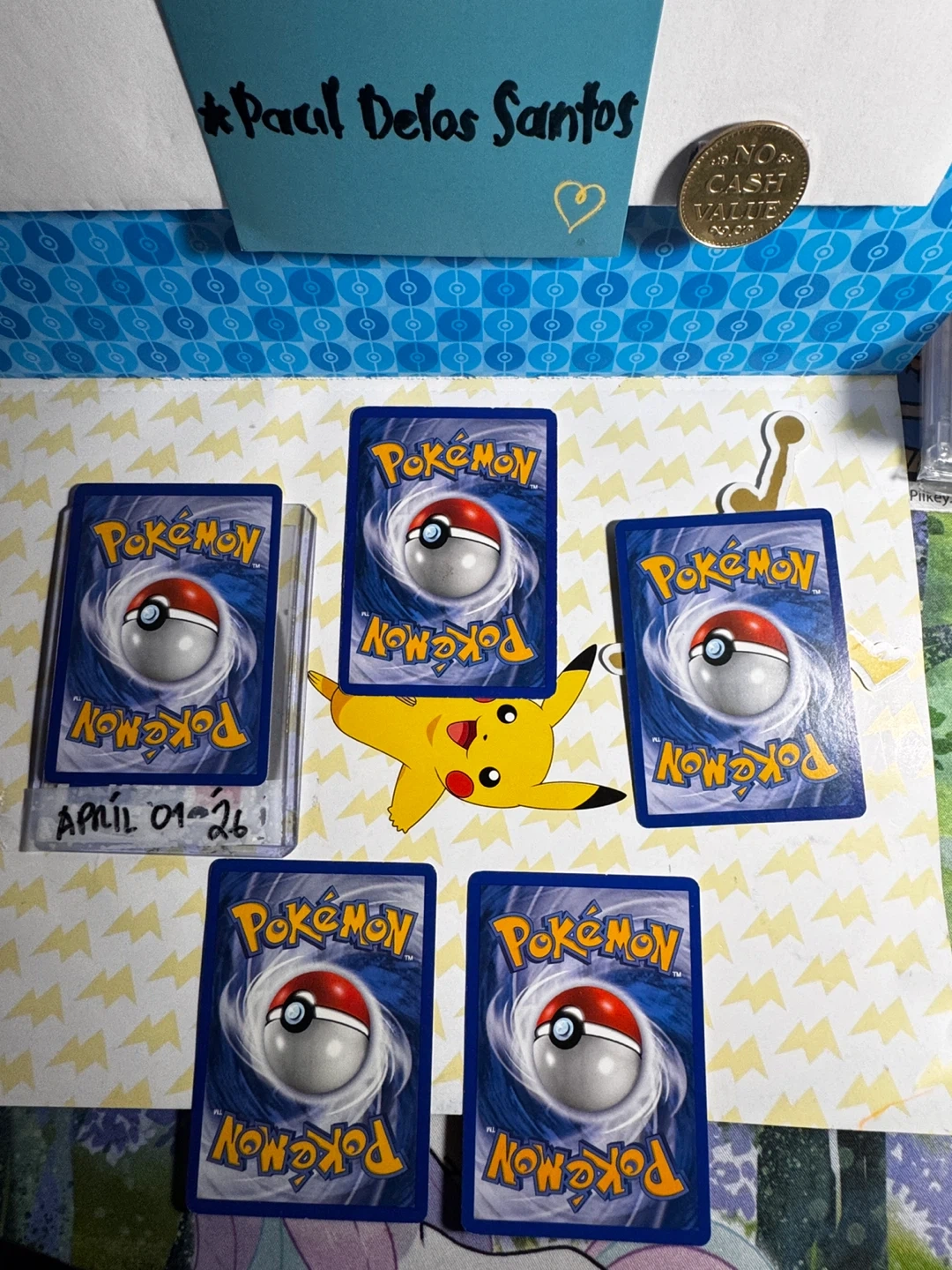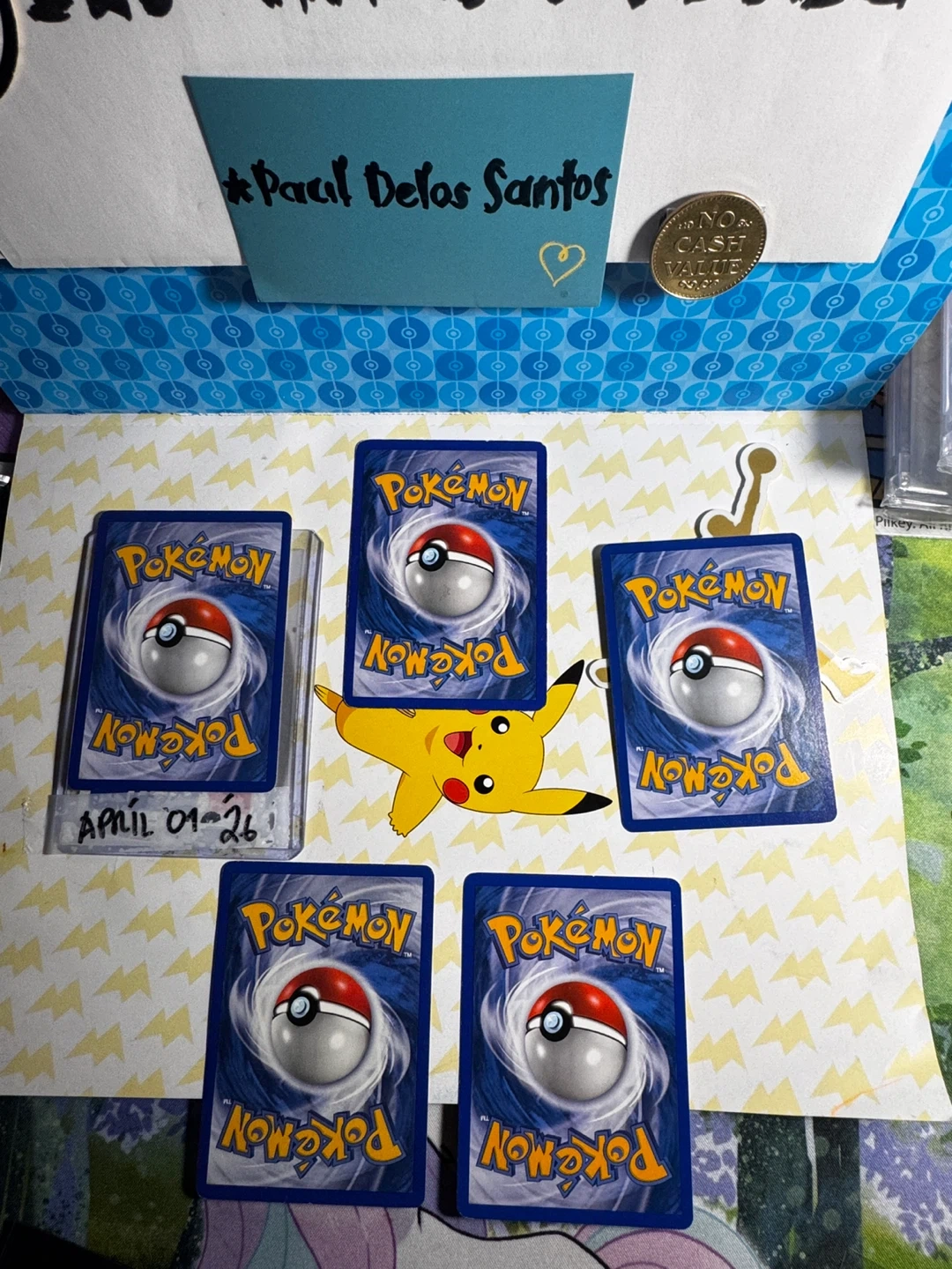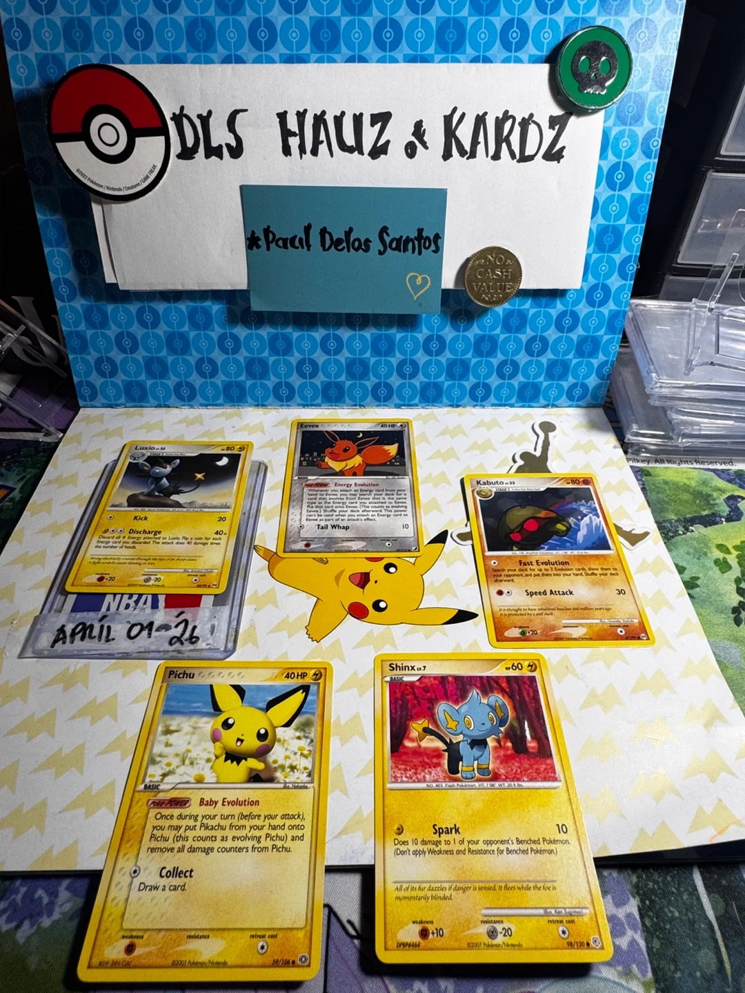 Collection of assorted Pokemon trading cards, including Pikachu, Eevee, Shinx, Kabuto, and Luxio. These cards are from the Pokemon franchise. Perfect for any Pokemon fan or collector!