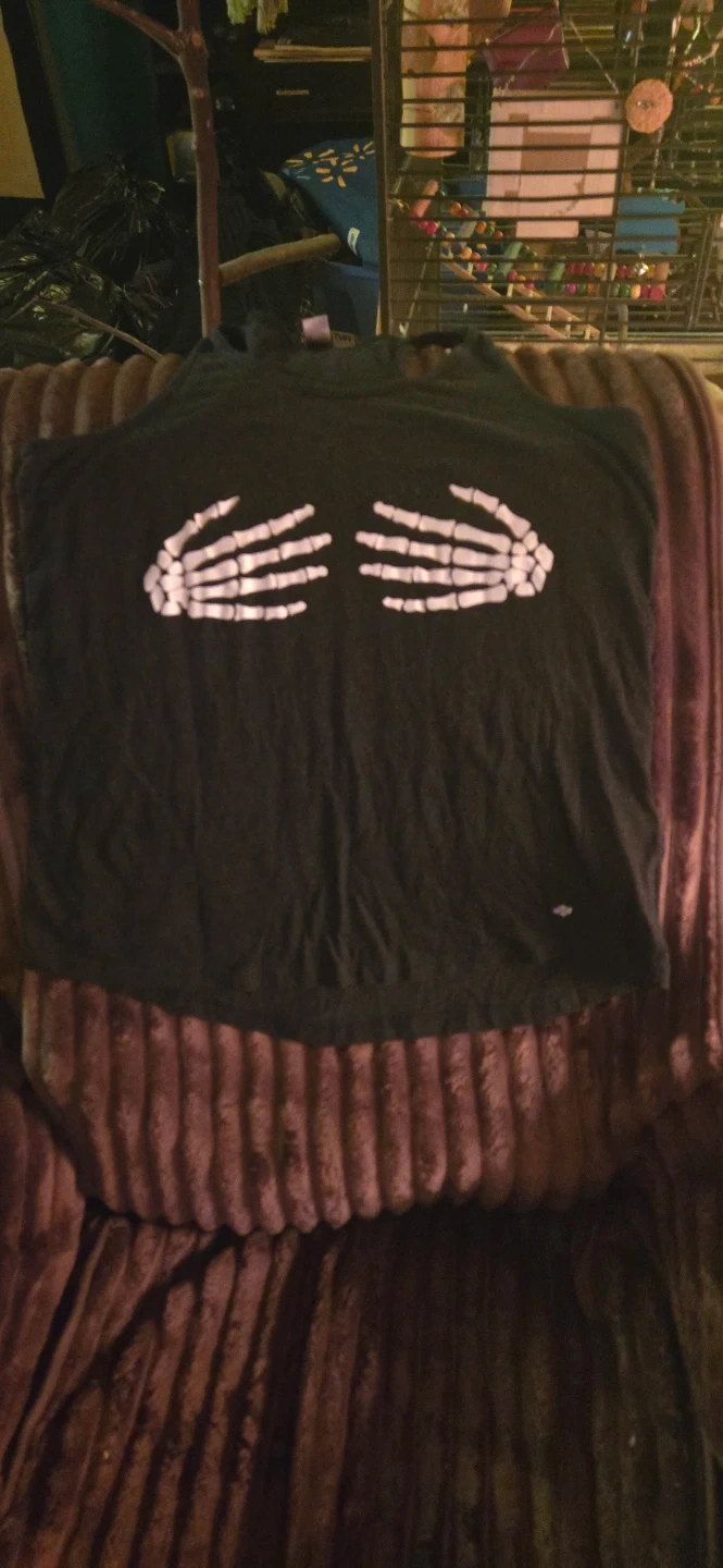 Black t-shirt featuring a white skeleton hands graphic on the front. It's a comfortable tank top. Perfect for spooky season or a fun, casual look! Size large worn only once