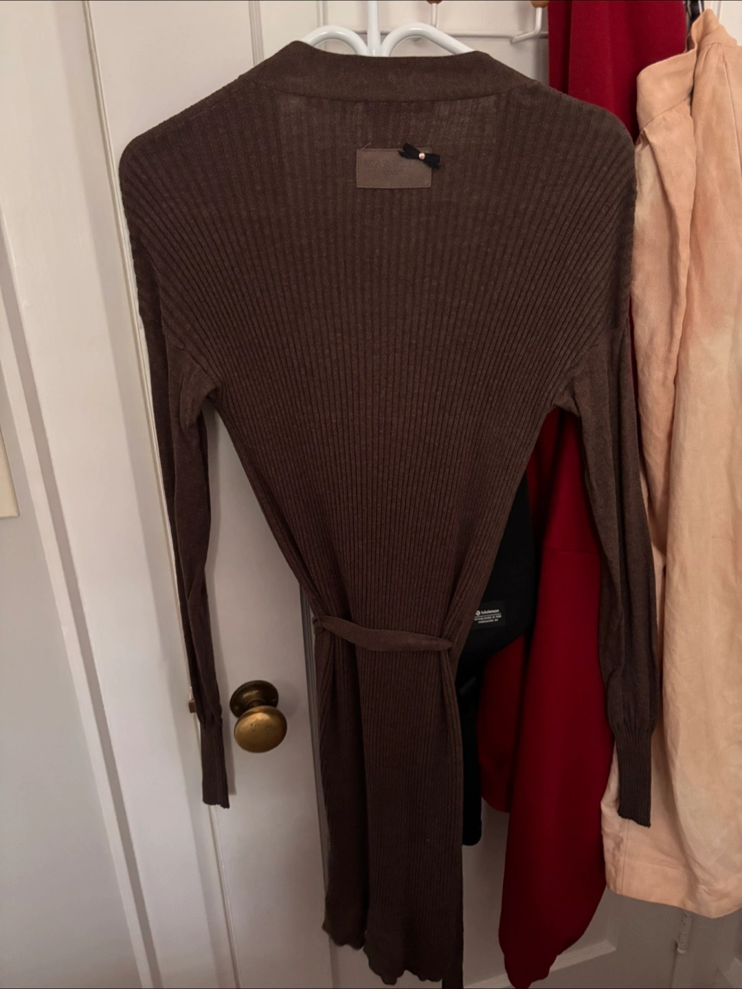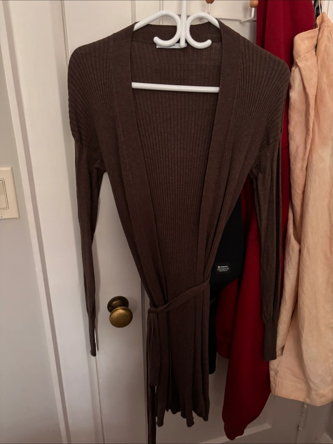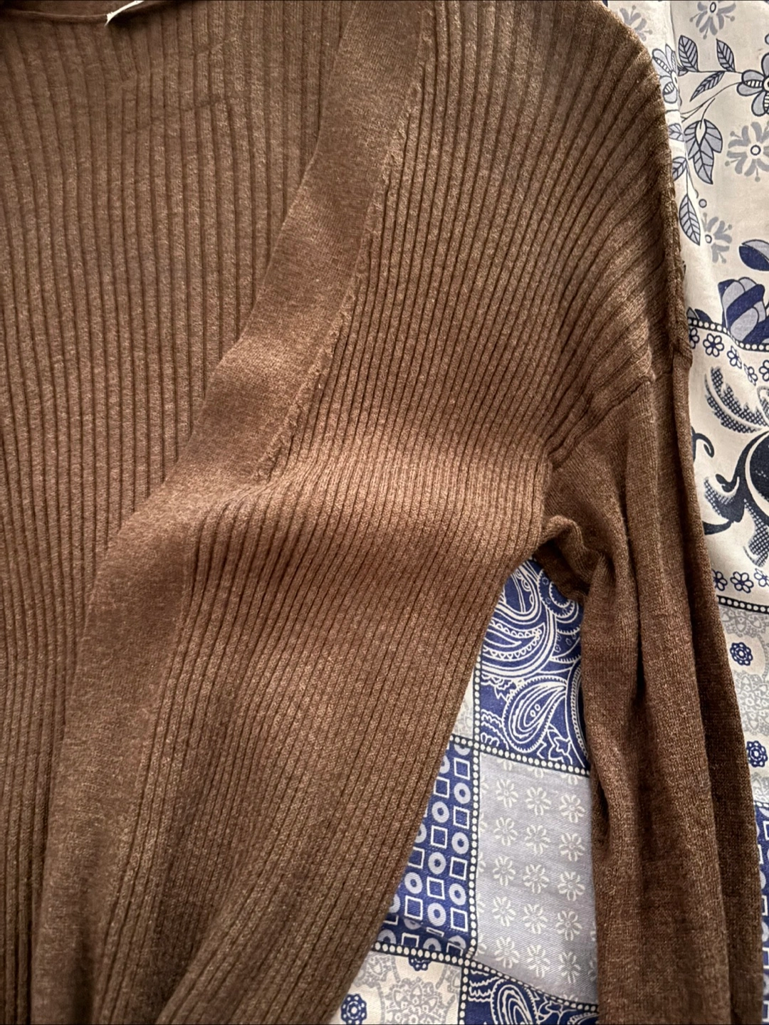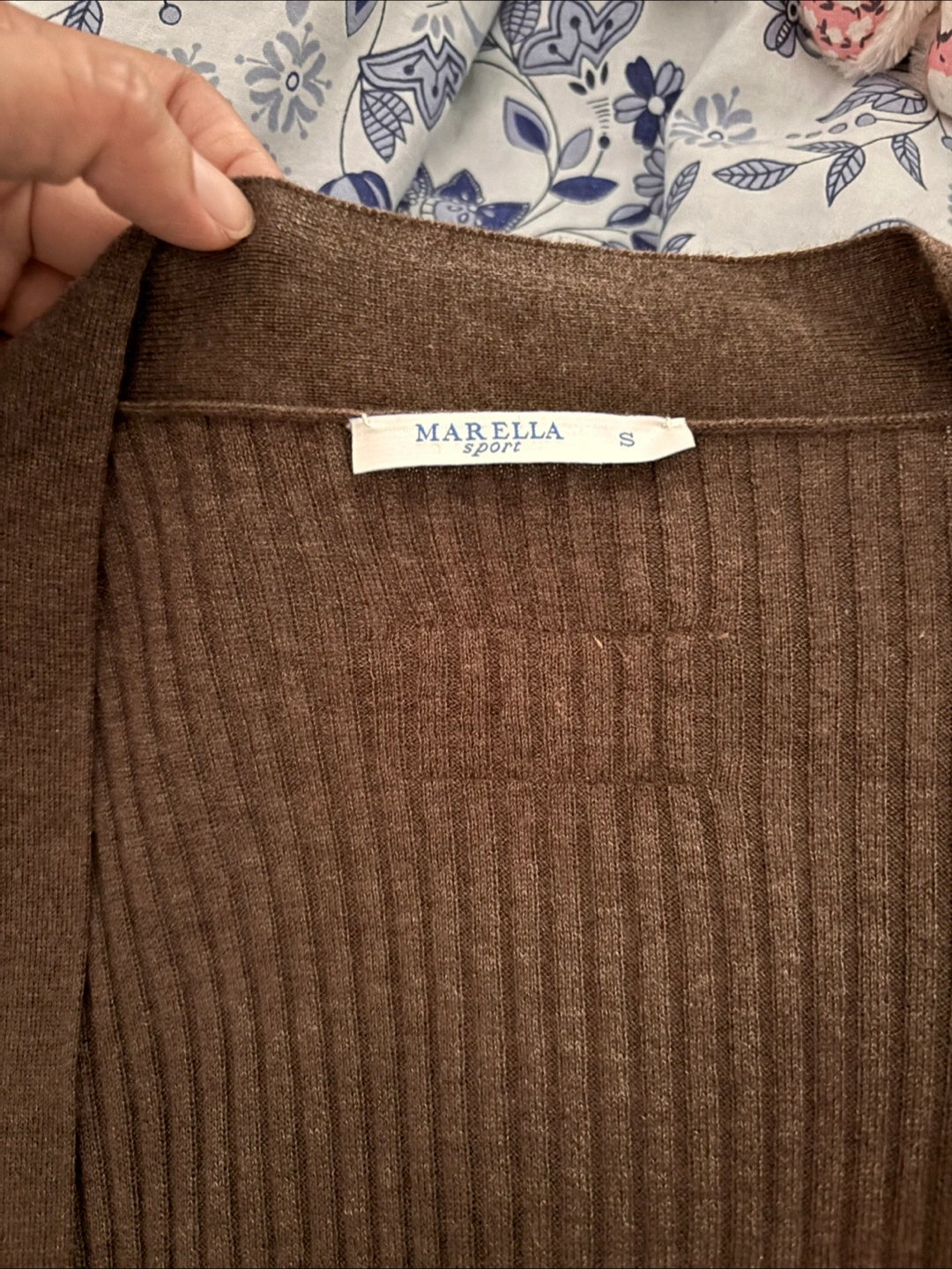 Selling a Marella Sport ( one of the lines owned by Max Mara) brown cardigan in size small. It's in great condition just like new, and features a ribbed texture. Very soft fabric made with wool and silk. Perfect for layering!