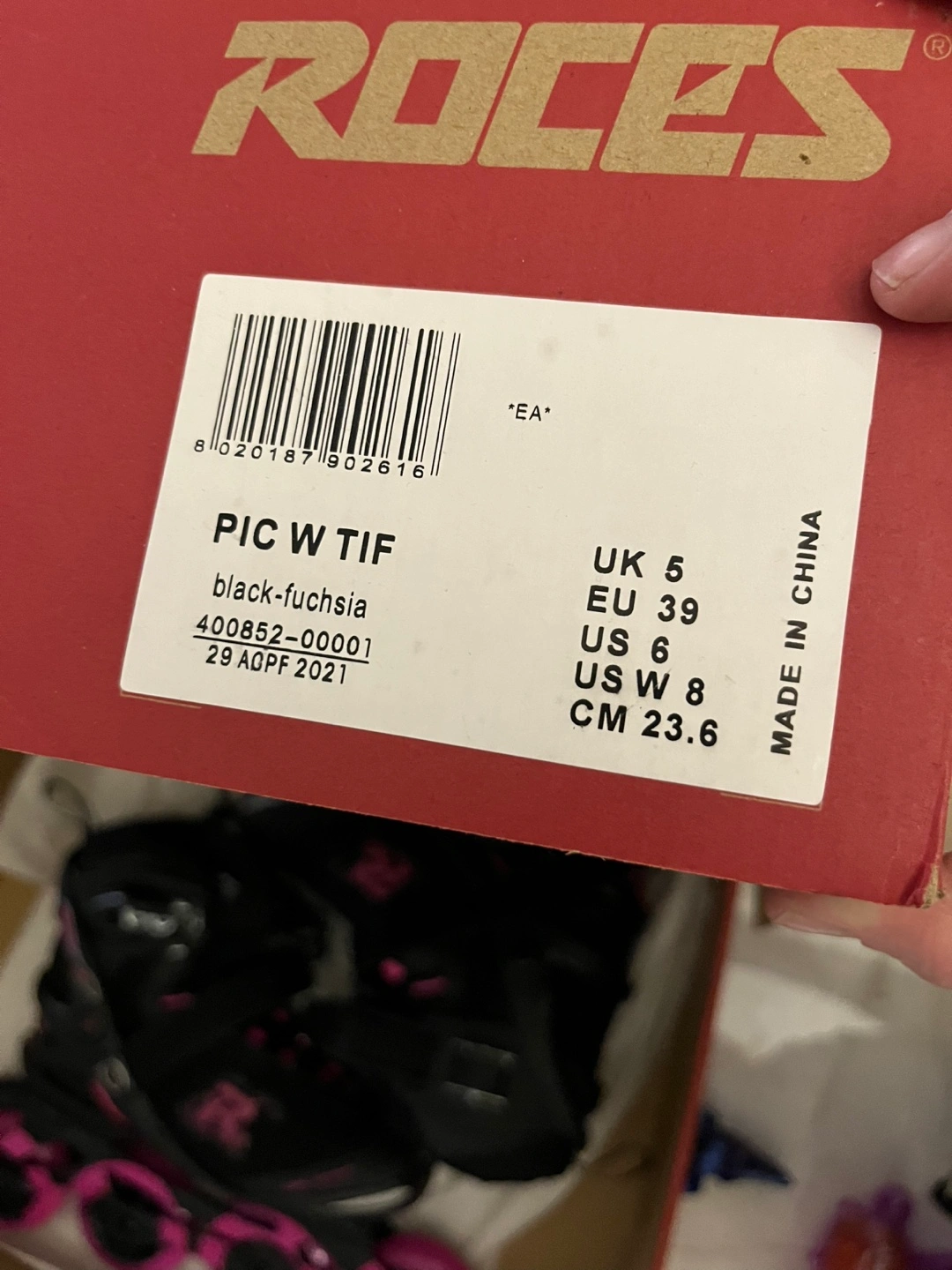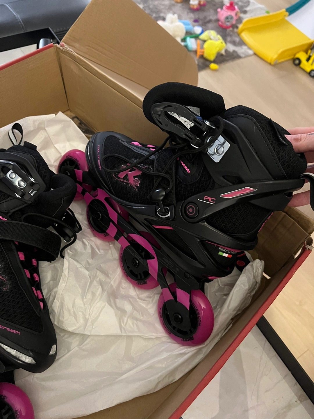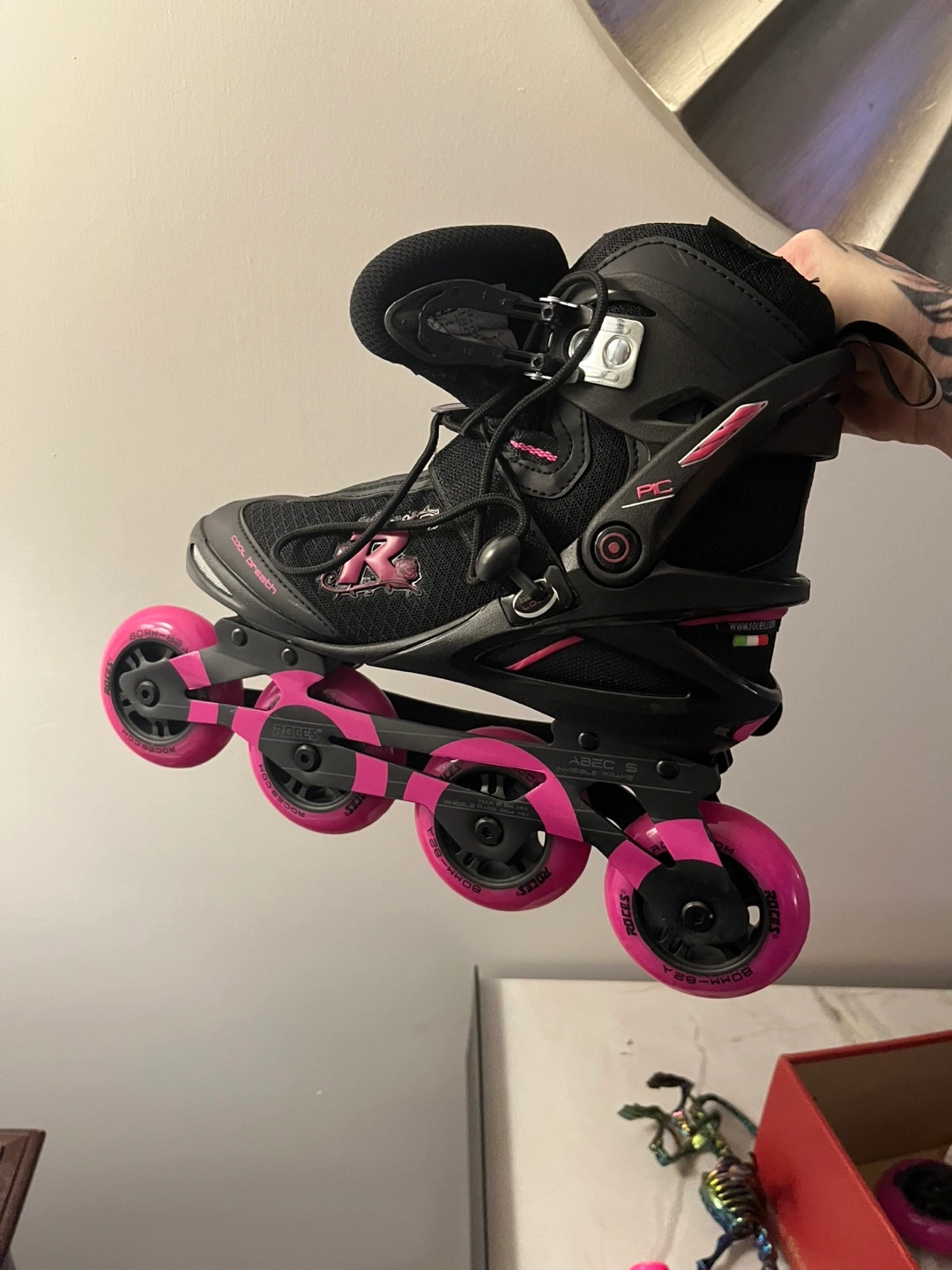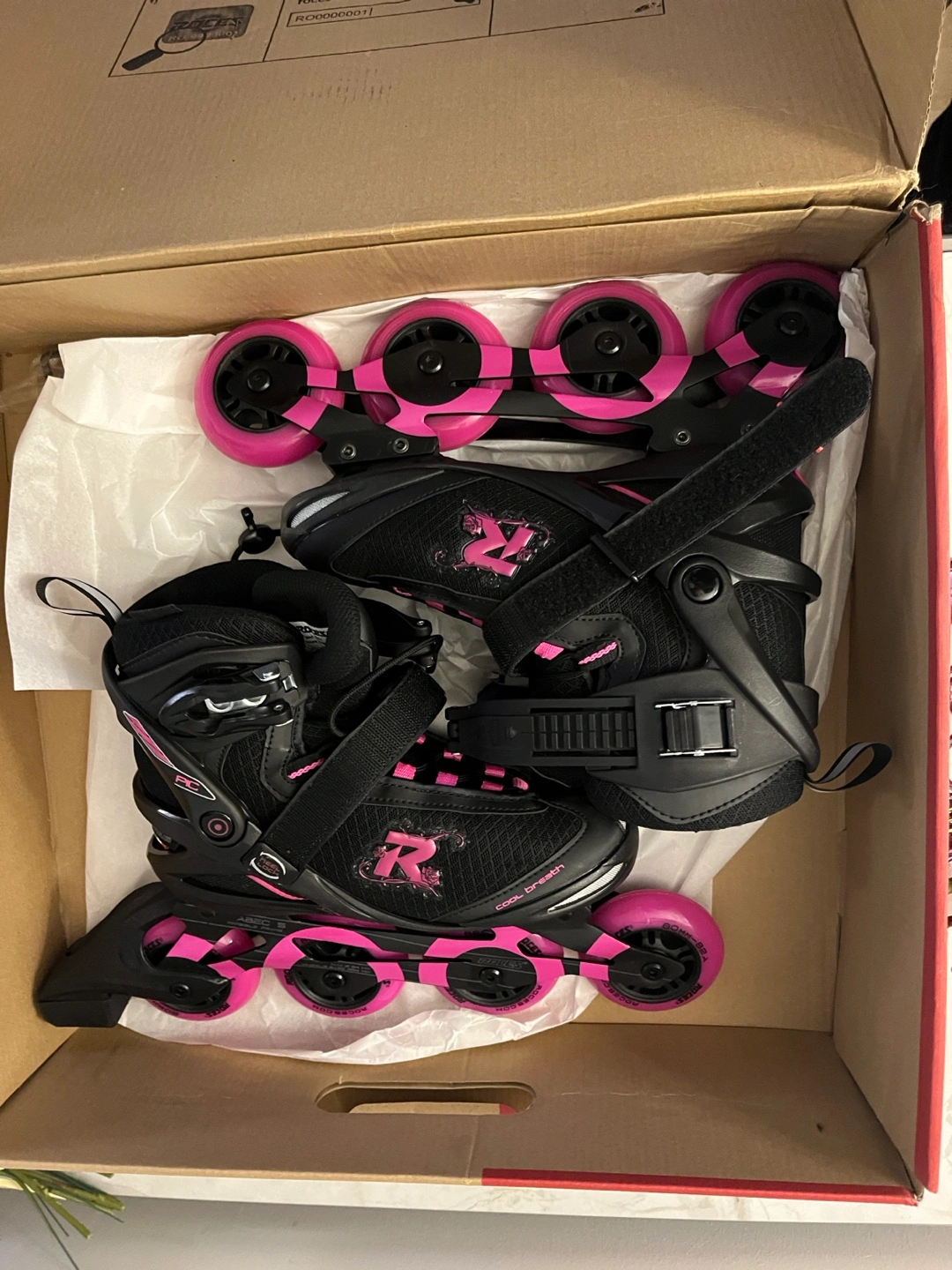 Inline skates featuring pink wheels and black boots, still in the box. Company sent the wrong size and refuse to fix their issue so just trying to get my money back for the purchase + shipping $120 SIZE: 6-6.5. Must try on before purchase as I bought them as an 8, my friend who is a 7 tried them on and too small as well.