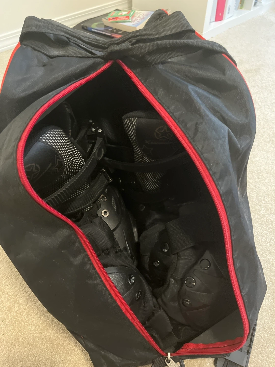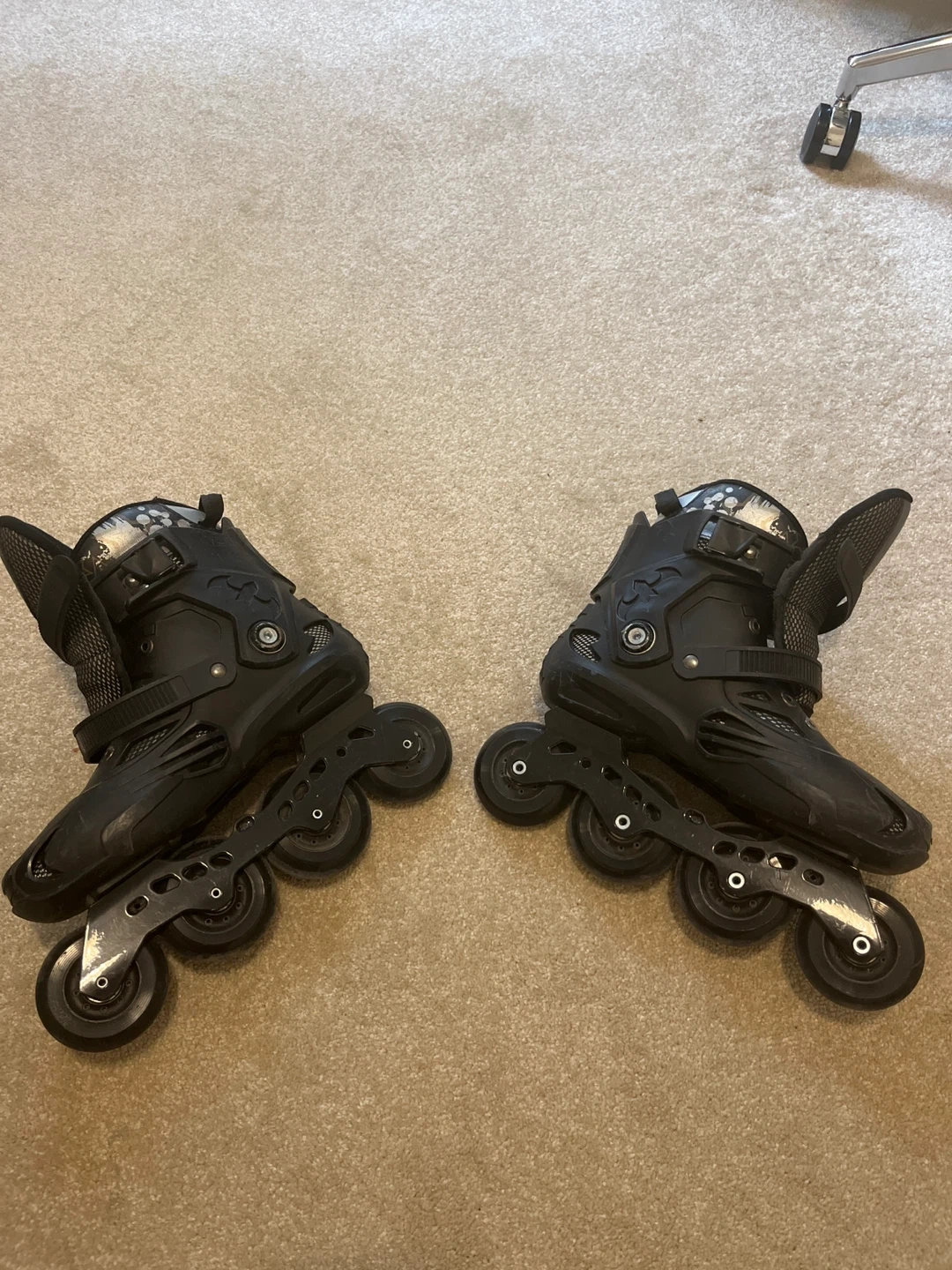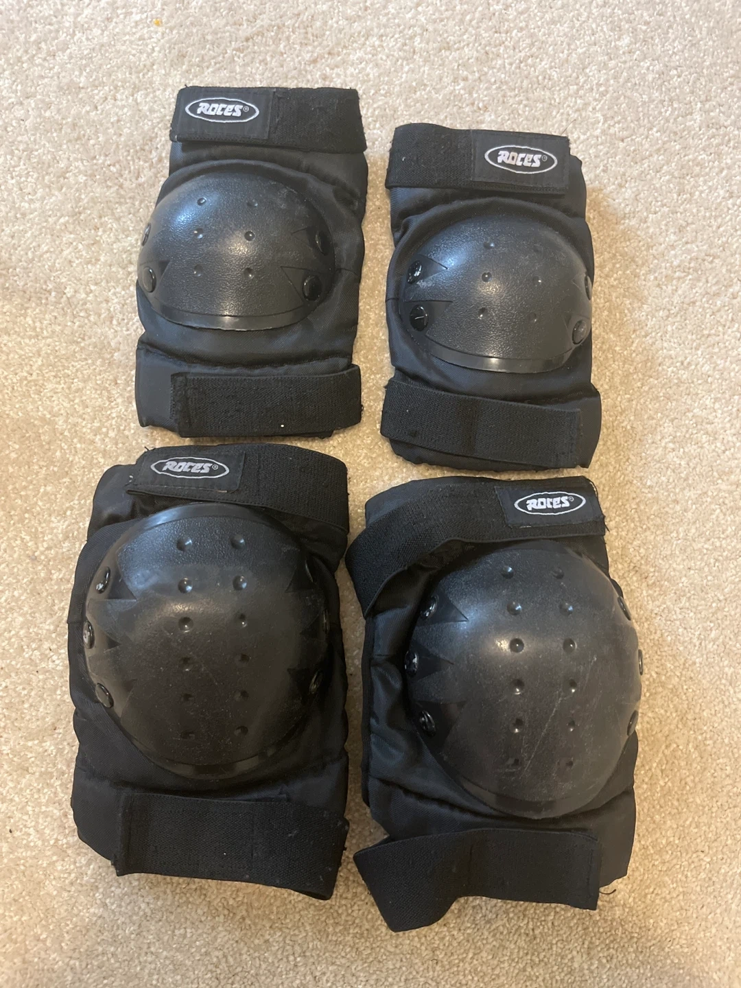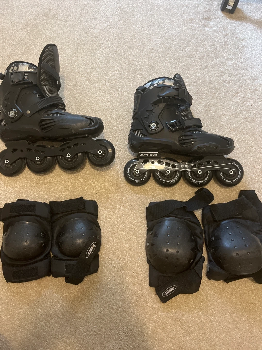 Selling a set of Roces inline skates in black, complete with knee and elbow pads, all packed in a Galaxy carrying bag. The skates appear to be in good condition and ready for some fun! fits sizes 6-9 Includes -roller skates -elbow pads -knee pads -bag price is negotiable