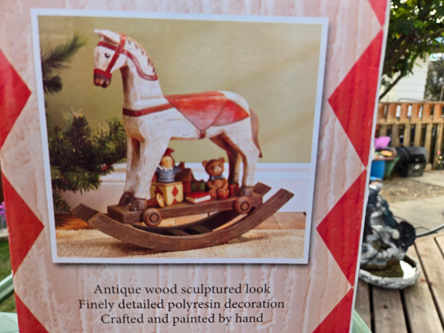 10This charming rocking horse is sure to bring joy to any space! It has an antique wood sculpted look with finely detailed polyresin decoration. Each one is crafted and painted by hand. It includes the rocking horse with a little teddy bear and jack-in-the-box toy. it's 20 inches long by 18 inches high